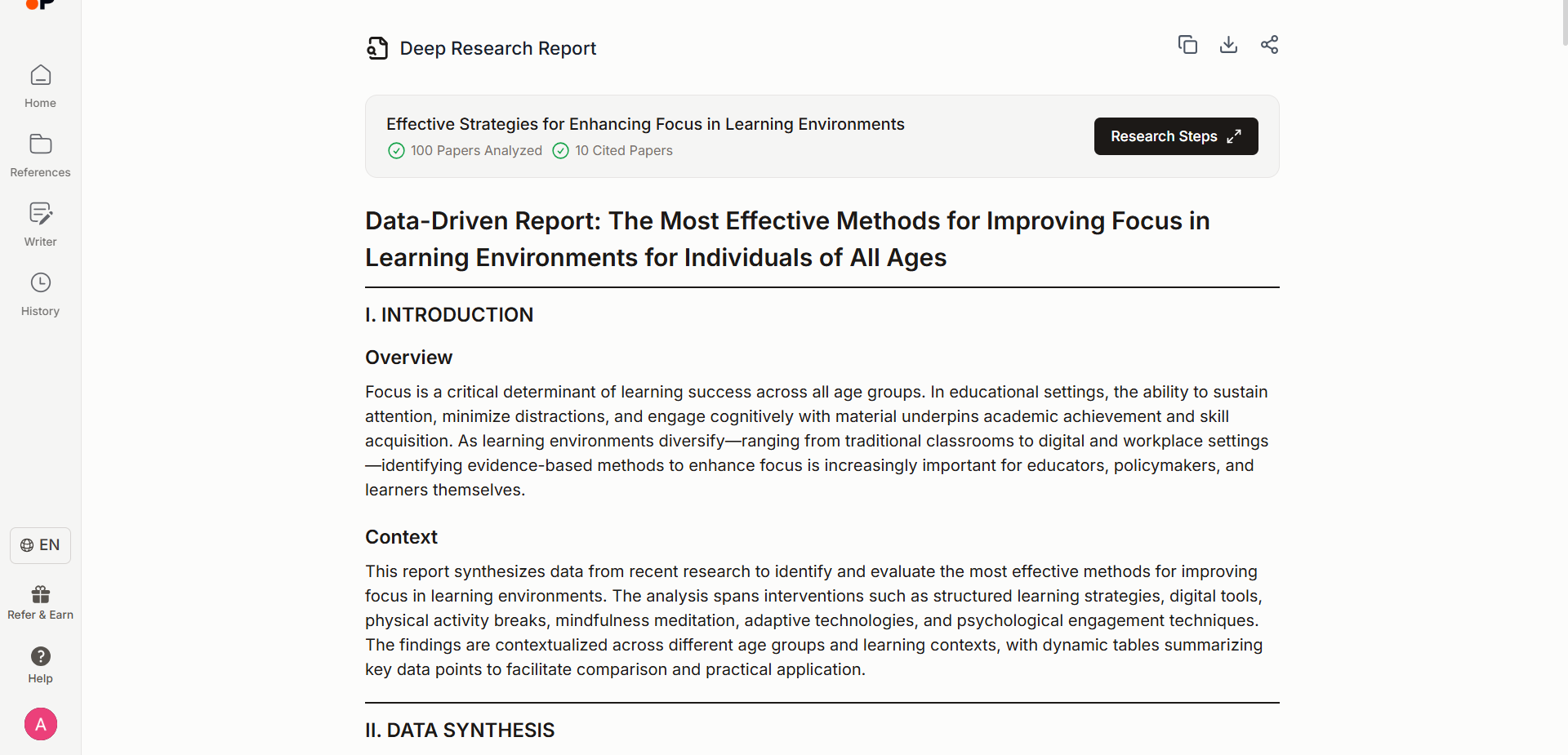 3. Tiefenforschungsberichte: Automatisieren Sie Ihre Forschung - von der Literaturentdeckung bis zu Forschungsberichten. Angetrieben von KI und semantischer Suche, findet, analysiert und synthetisiert es Hunderte von Arbeiten mit einem einzigen Klick.