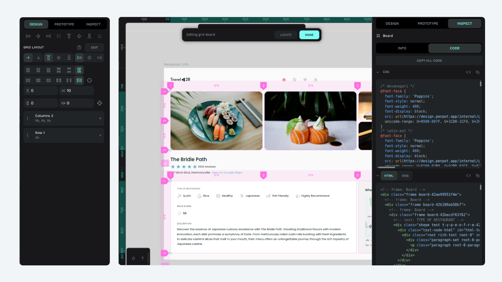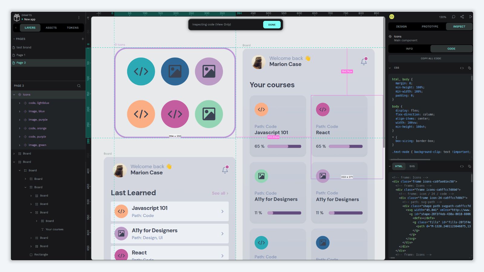 - Entwicklerfreundliche Workflows: Penpot wurde von Anfang an entwickelt, um sowohl Designern als auch Entwicklern zu dienen und einen nahtlosen Design-Code-Prozess zu schaffen. Der Inspektions-Tab bietet sofortigen Zugriff auf SVG-, CSS- und HTML-Code. Design als Code ausgedrückt, um Entwickler-Workflows schneller und einfacher zu machen.