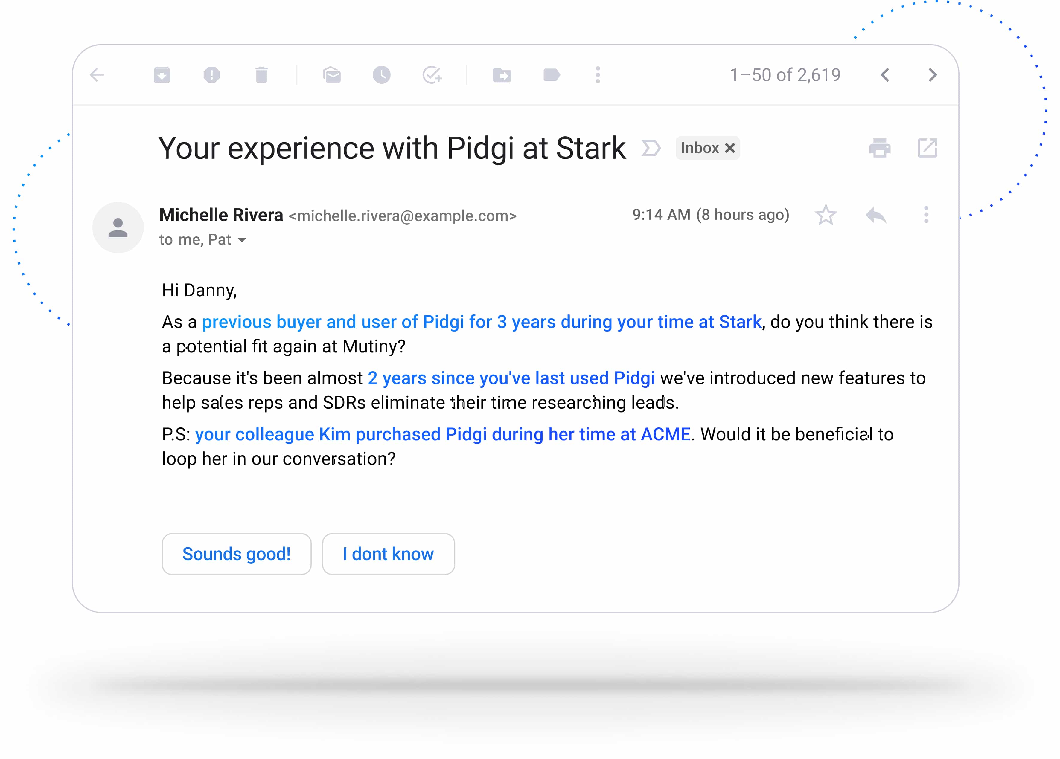 Ich mochte, wie viel Zeit das gespart hat. Die meisten Menschen, die Software kaufen, sind frühere Nutzer der Lösung. Pidgi kann automatisch einen früheren Software-Nutzer identifizieren; es hebt die Jahre hervor, in denen der Mitarbeiter die Lösungen genutzt hat, und wie viele Unternehmen er durchlaufen hat. Pidgi kann auch gezielt eingesetzt werden, um nur die Rollen zu identifizieren, die in einem Unternehmen von Interesse sind. Die Entscheidungsträger zu finden, die Alumni sind, ist ein wahr gewordener Traum! Bewertung gesammelt von und auf G2.com gehostet.