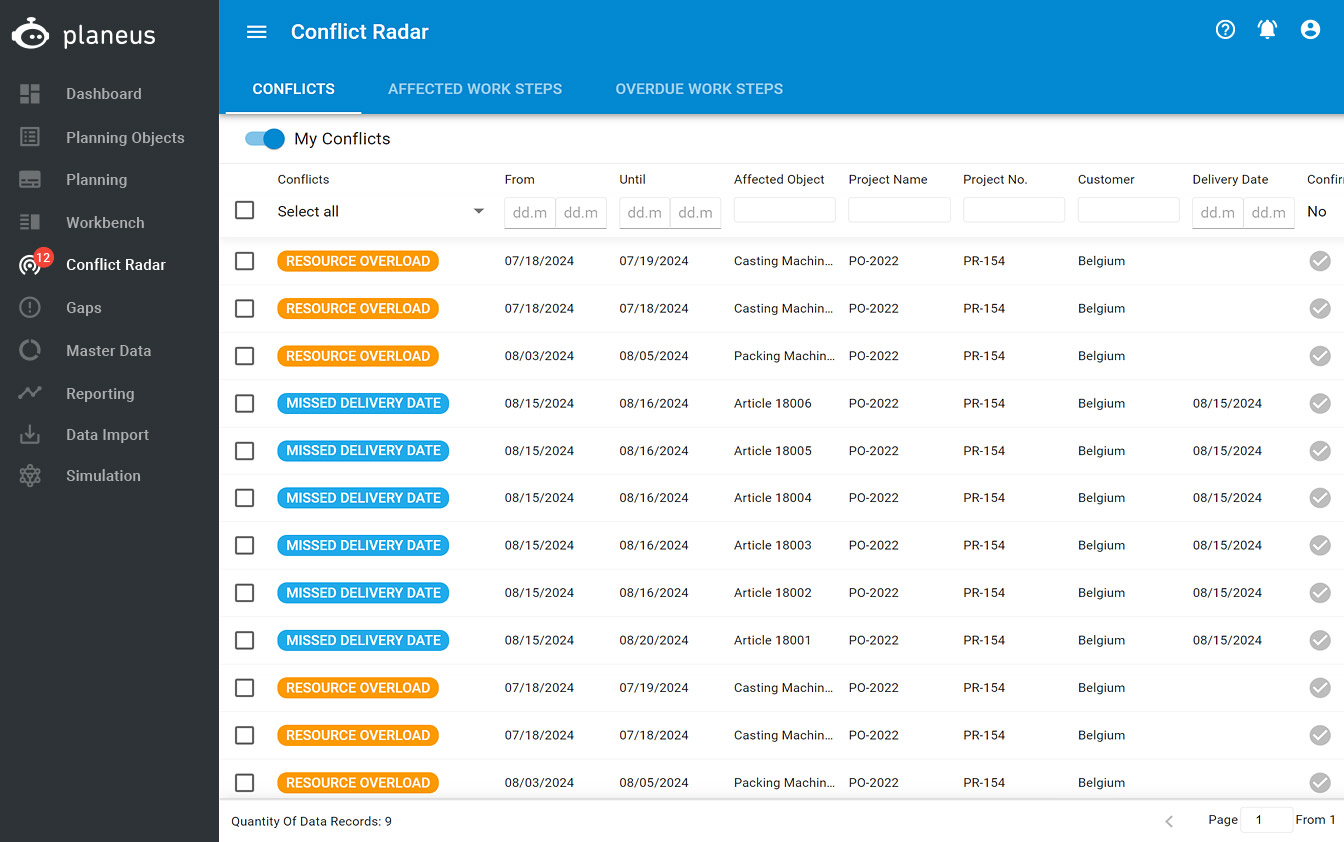 Gantt-Diagramm-Bestellprozessinformationen ziehen und Konfliktradar verwenden, um bevorstehende Konflikte zu sehen.