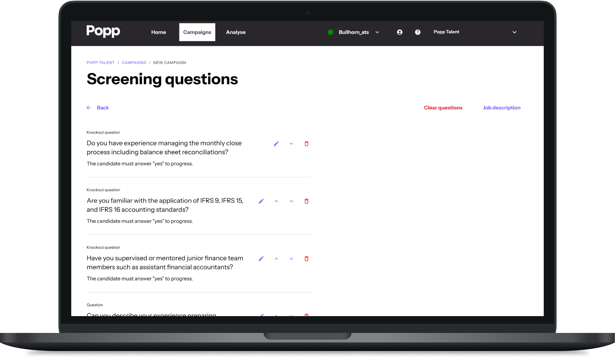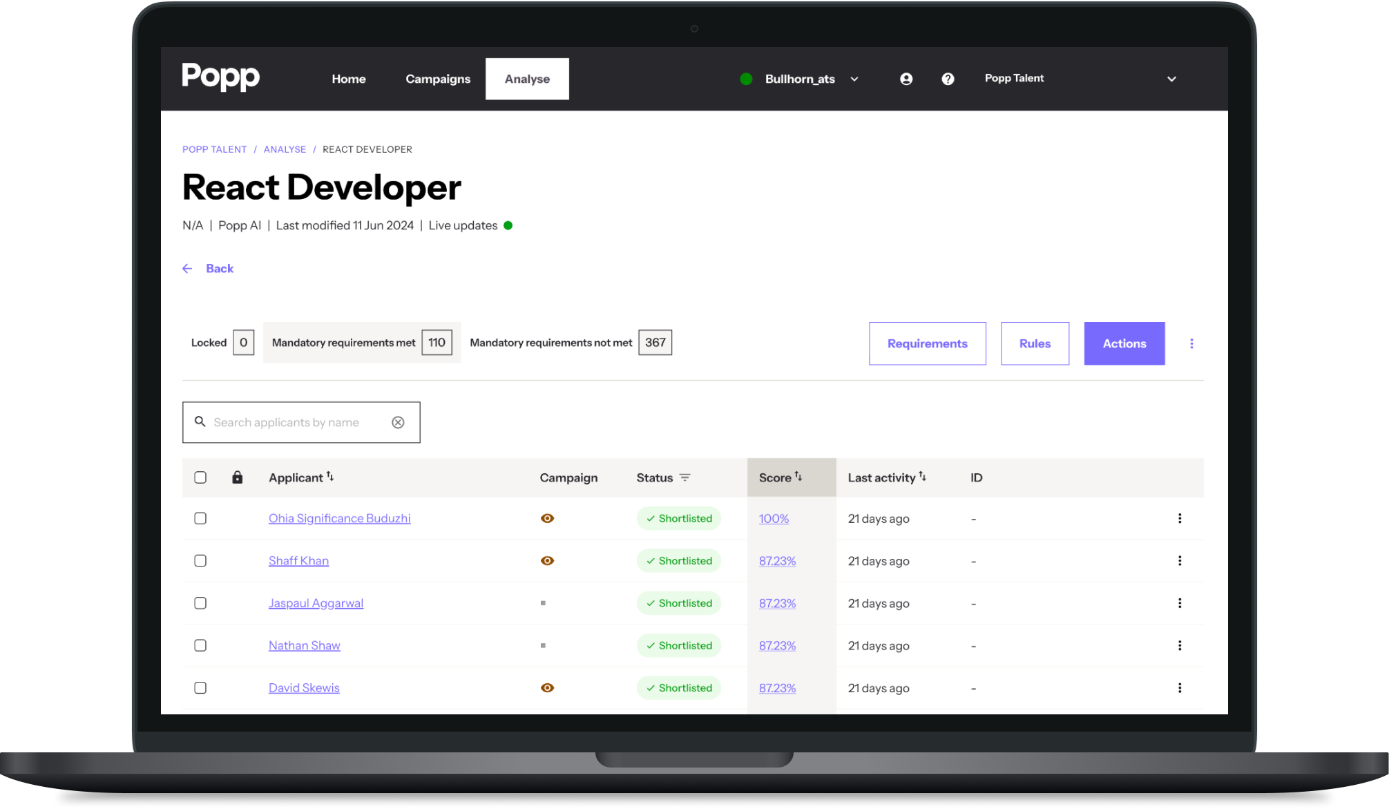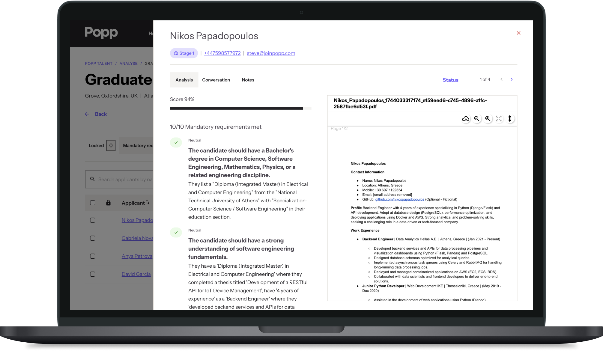 Popp ermöglicht es Ihnen, Tausende von Bewerbungen automatisch anhand Ihrer bevorzugten Kriterien zu überprüfen. Wir bearbeiten alle Bewerbungen und bewerten sie systematisch auf konsistente Weise, damit Sie die beste Person für den Job finden können, ohne stundenlang zu überprüfen.