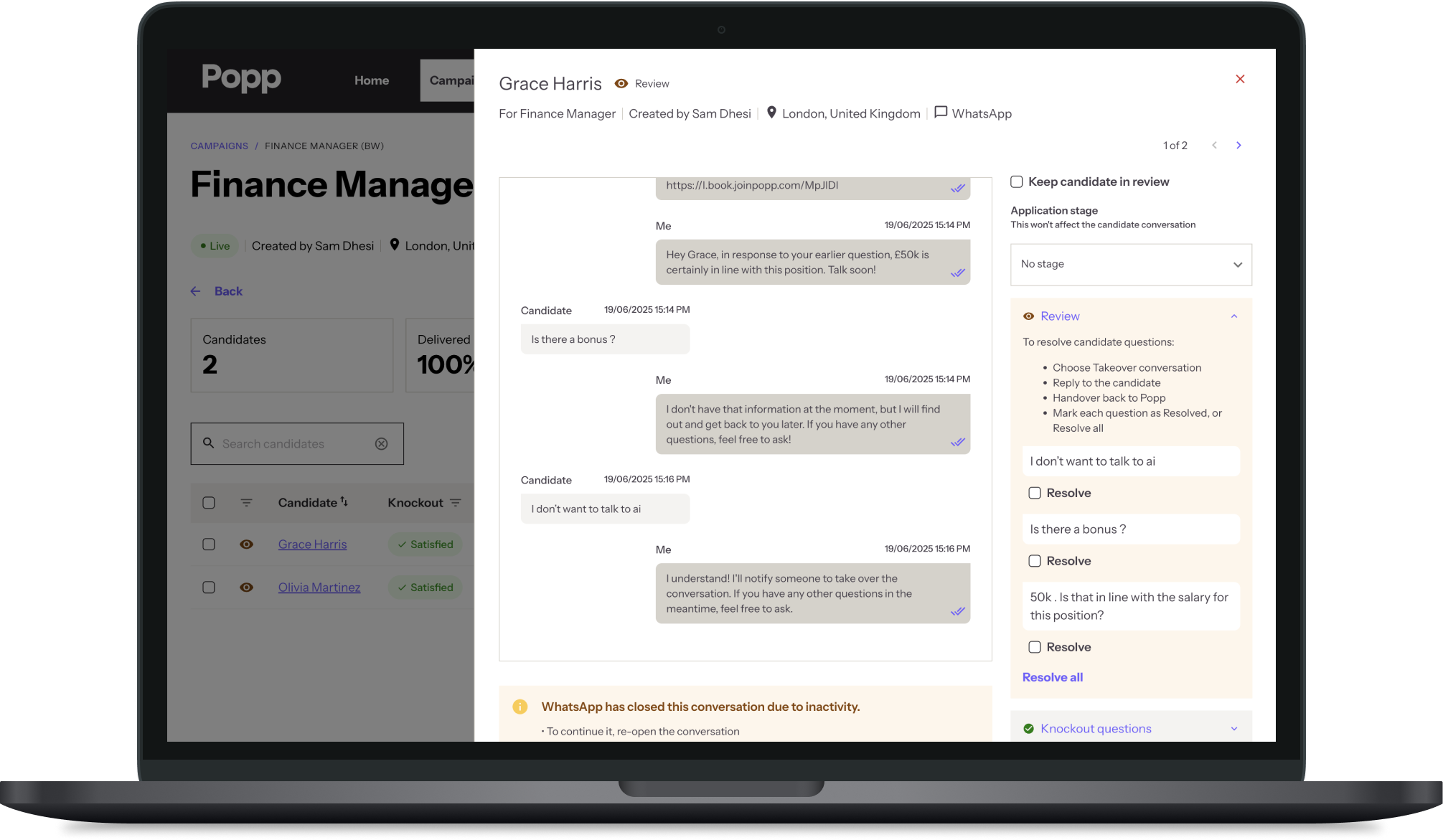 Popp ermöglicht es Ihnen, Tausende von ausführlichen Kandidatengesprächen gleichzeitig zu führen. Durch offene Dialoge helfen wir Ihnen, fehlende Anforderungen aus einer Bewerbung zu überprüfen, wichtige Dokumente zu sammeln und zu validieren und Antworten anhand von Bewertungsbögen in großem Maßstab zu bewerten.