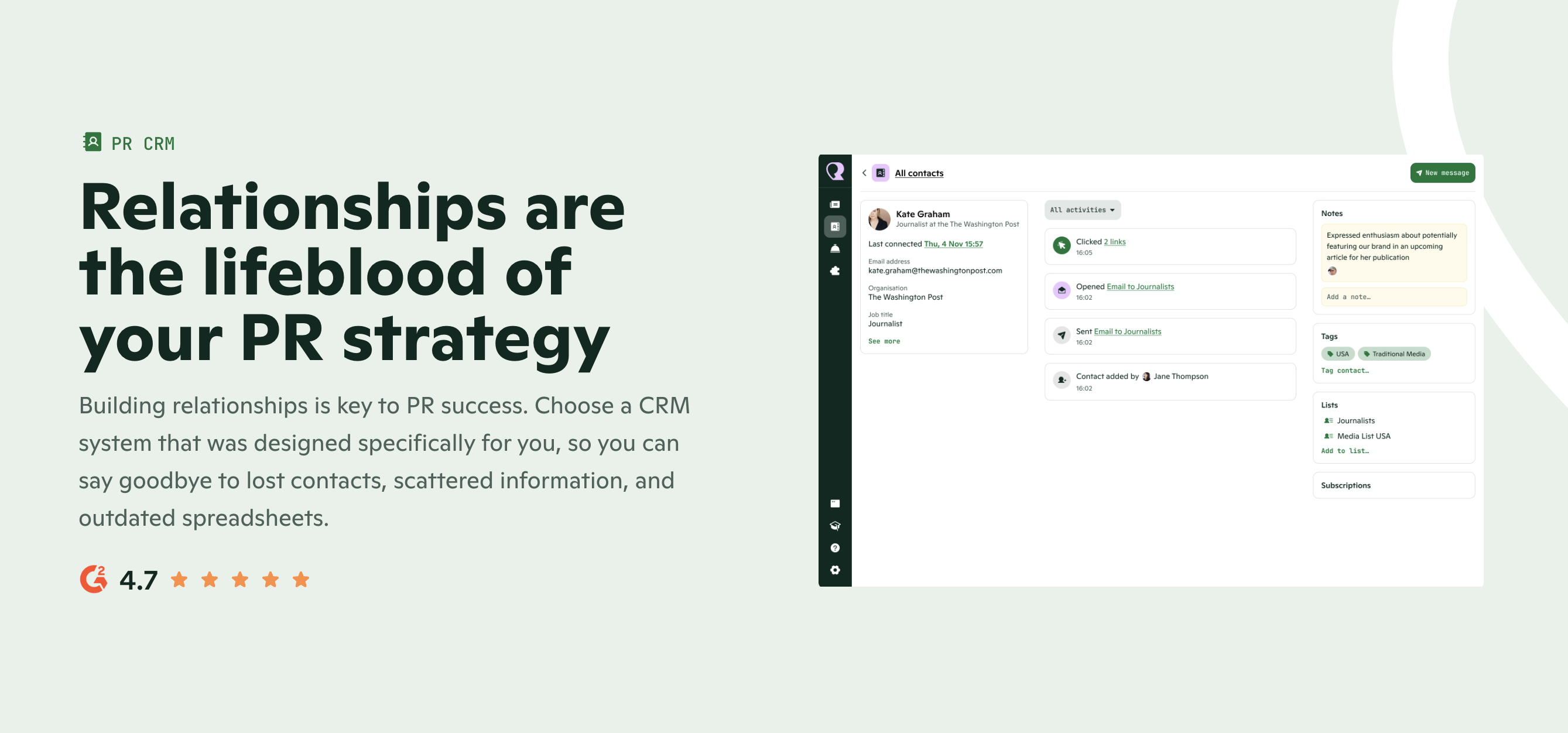 Ein anfänglicher Schmerzpunkt war, dass PR.co nicht natürlich in unser spezifisches CRM-System passte, jedoch wurde dies leicht behoben, indem das PR.co-Team einige Anpassungen im Backend vornahm. Wie ich schon sagte, sie gehen wirklich über das Gewöhnliche hinaus! Bewertung gesammelt von und auf G2.com gehostet.