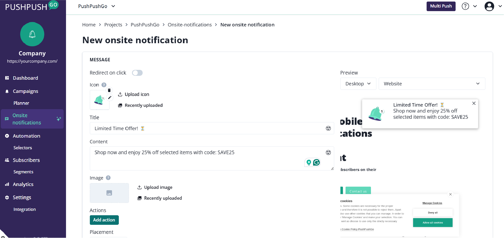Enable onsite notifications to boost real-time engagement directly on your website.