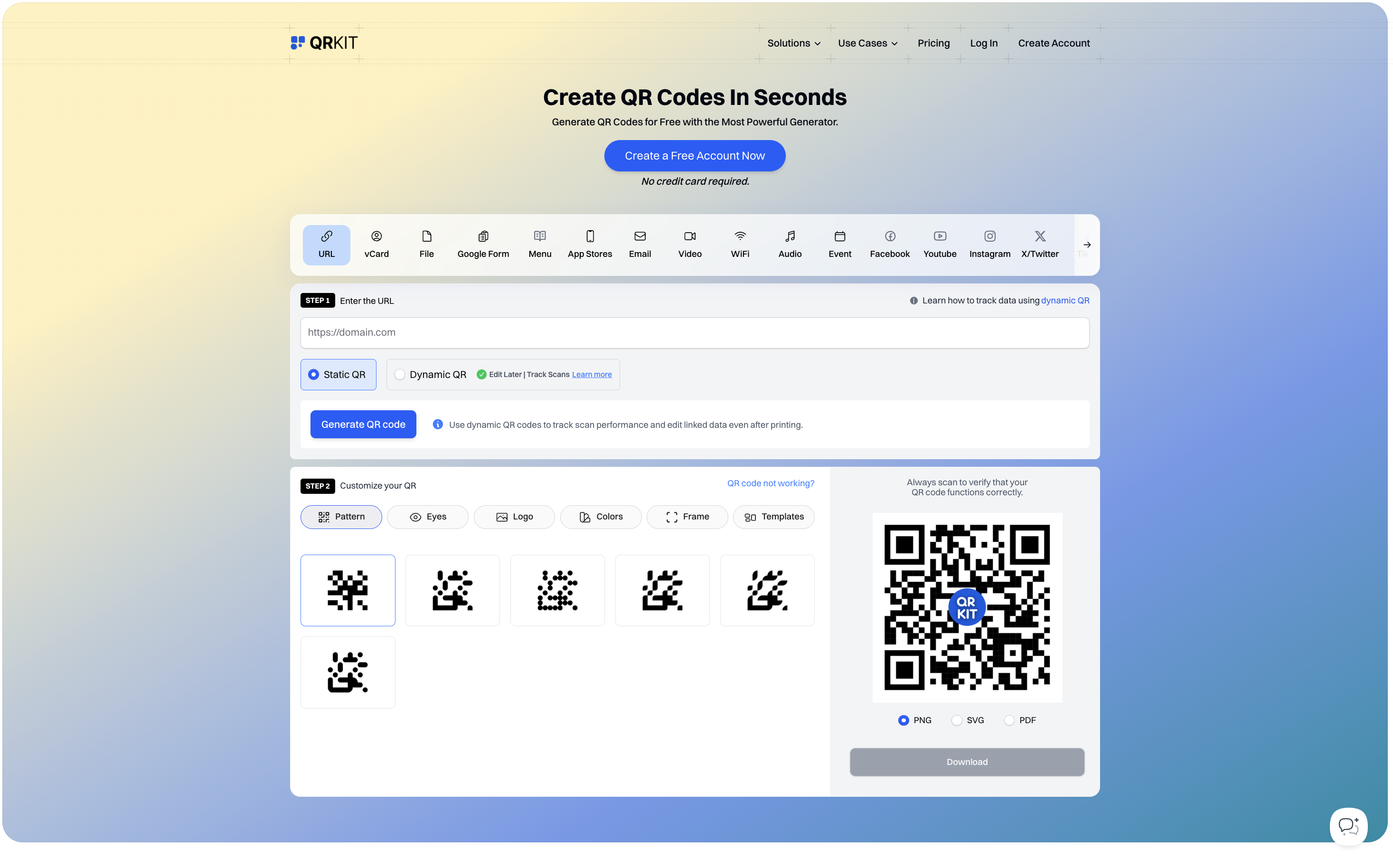 QRKit ist eine All-in-One-QR-Code-Plattform, die das Engagement steigert und die Kampagnenleistung optimiert. Erstellen und bearbeiten Sie dynamische Codes, überwachen Sie Echtzeitanalysen und passen Sie das Branding mühelos an, alles sicher, intuitiv und darauf ausgelegt, Ihnen Zeit zu sparen.