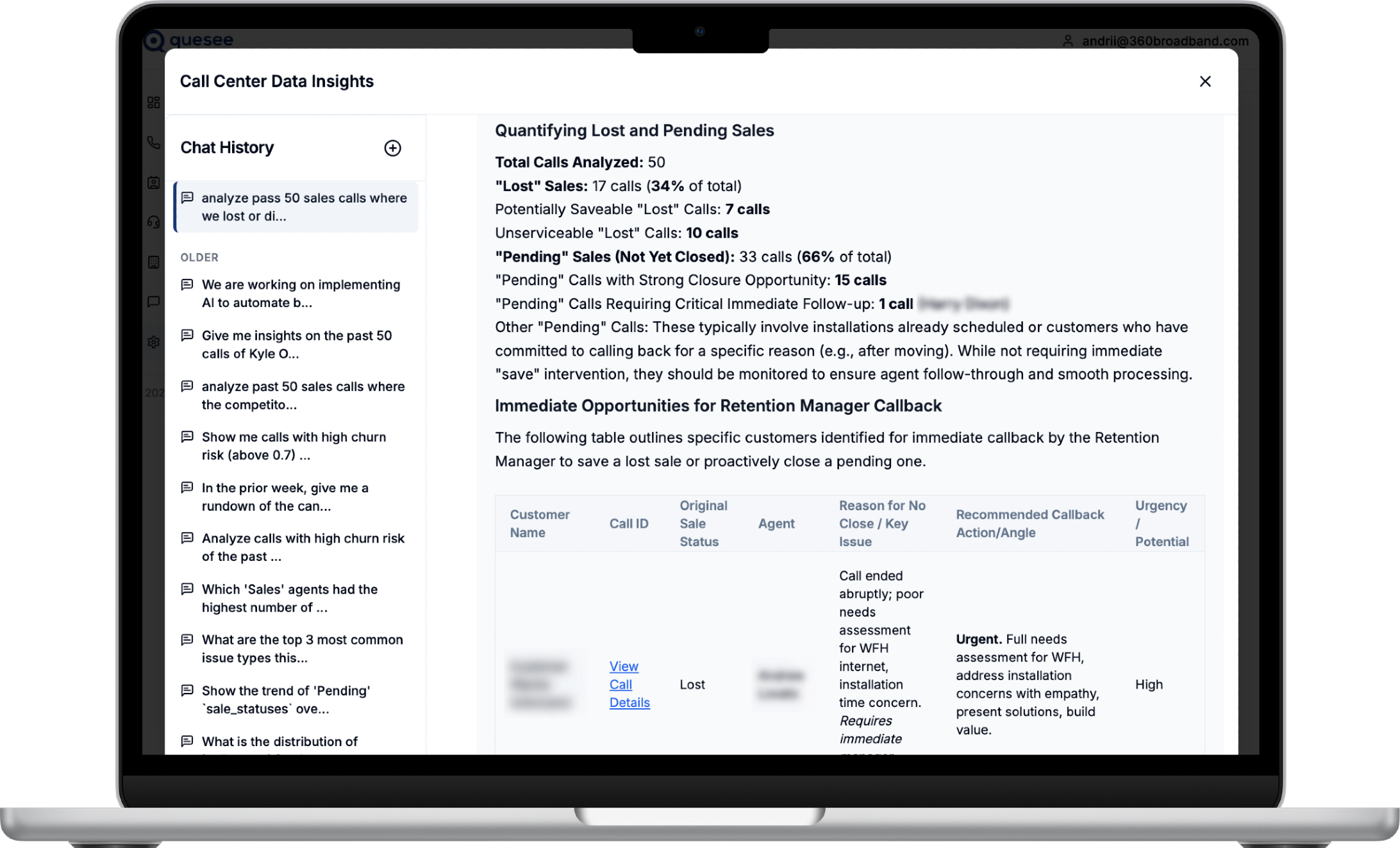 Die Plattform integriert sich nahtlos in Ihr CRM und Ihre VoIP-Systeme und liefert garantierte Abwanderungsreduktion, vollautomatische Qualitätskontrolle und umsetzbare Erkenntnisse, einschließlich Wettbewerbsanalyse, Stimmungsverfolgung und Identifizierung gewinnbarer verlorener Verkaufschancen für Rückrufe durch Manager.