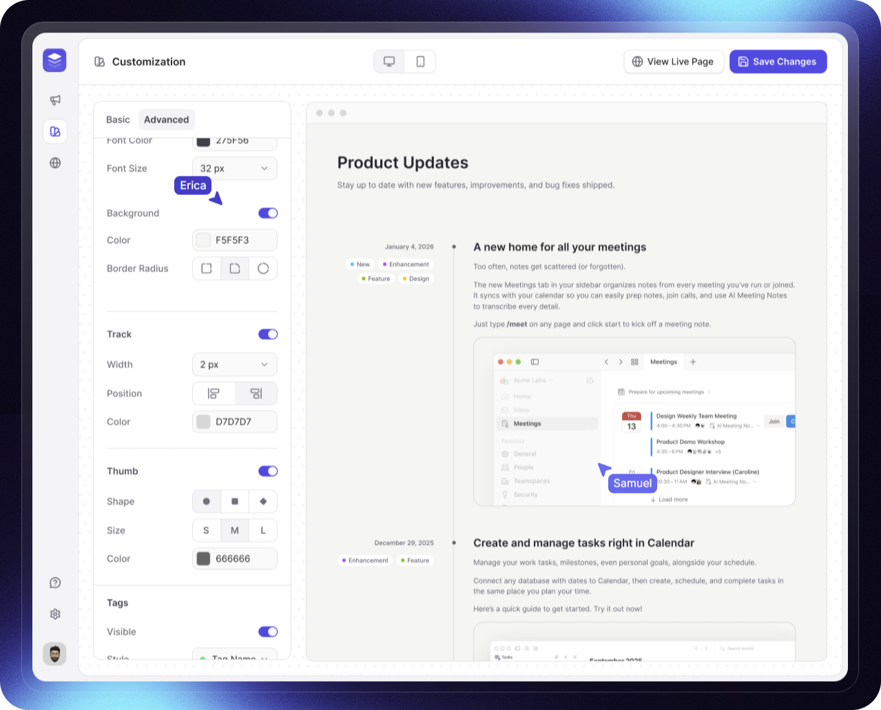 Verbessern Sie das Benutzerengagement mit einem einfach zu bedienenden Newsfeed und Änderungsprotokoll. Verwenden Sie Beamer, um relevante Nachrichten, Ihre neuesten Funktionen und Updates anzukündigen.