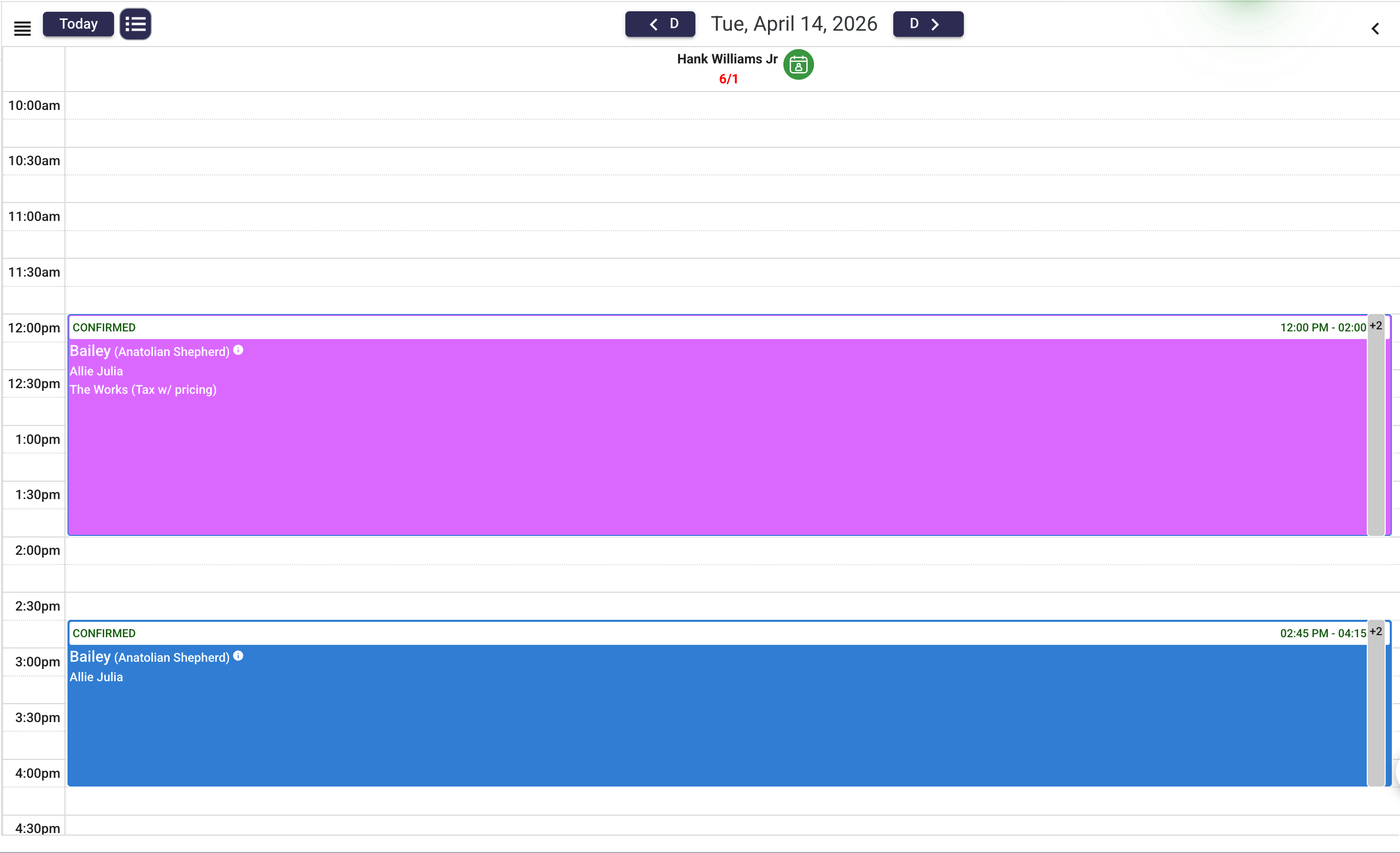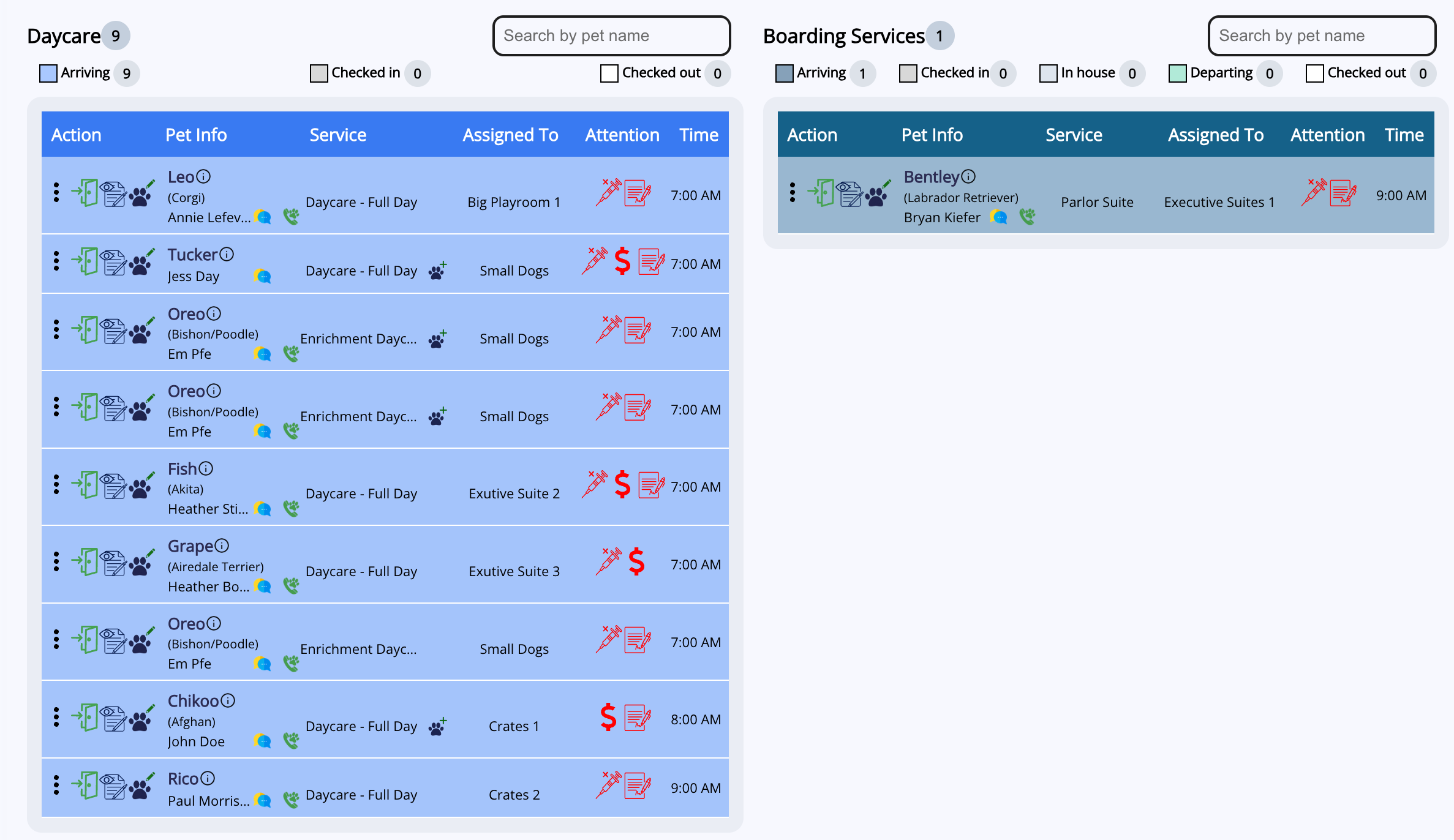 Pawfinitys saubere, schnelle und intuitive Benutzeroberfläche verbessert die Effizienz in Ihrem Hundesalon, Ihrer Tierpension, Ihrem Boarding-Betrieb, Ihrer Hundetagesstätte oder Ihrem Haustierbetreuungsunternehmen und reduziert gleichzeitig die mit der Organisation und Nutzung von Kundeninformationen verbundenen Gemeinkosten.