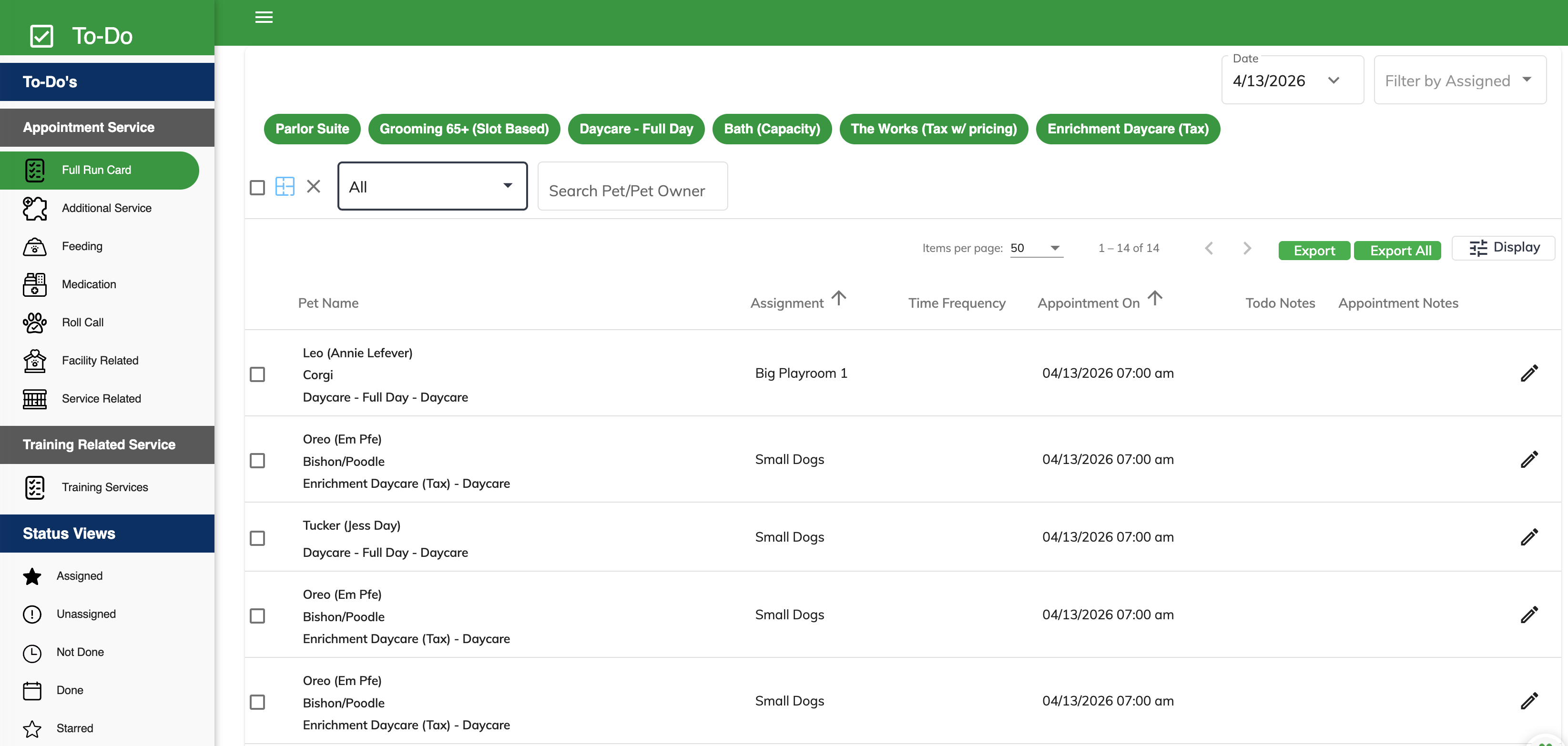 DaySmart Pet (ehemals 123pet) ist eine Managementlösung für das Haustierdienstleistungsgewerbe, die alle Aspekte der Branche abdeckt, einschließlich Pflege und Tagesbetreuung. Robust und innovativ bietet DaySmart Pet alles von fortschrittlichen Marketing-Tools und Online-Buchung bis hin zu intuitiver Terminplanung und mobilen Apps. Mit dem alltäglichen Unternehmer im Blick ermöglicht DaySmart Pet den Nutzern mehr Zeit für ihr Handwerk und ihre Kunden, rationalisiert Geschäftsvorgänge und verbessert das Zeitmanagement, um den Gewinn zu steigern und die Produktivität aufrechtzuerhalten.