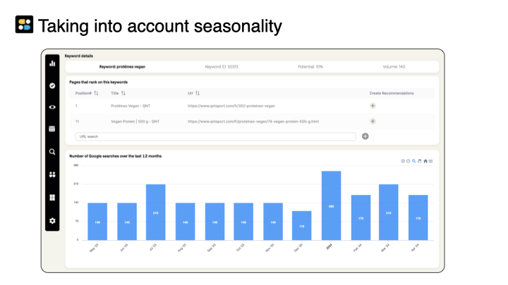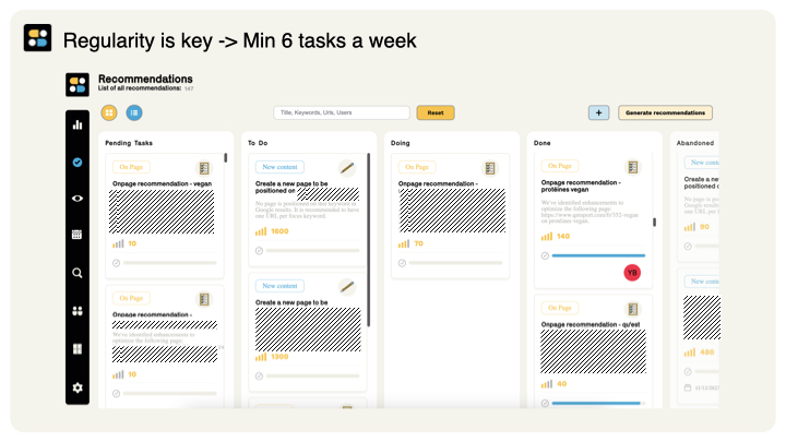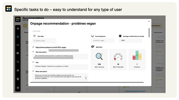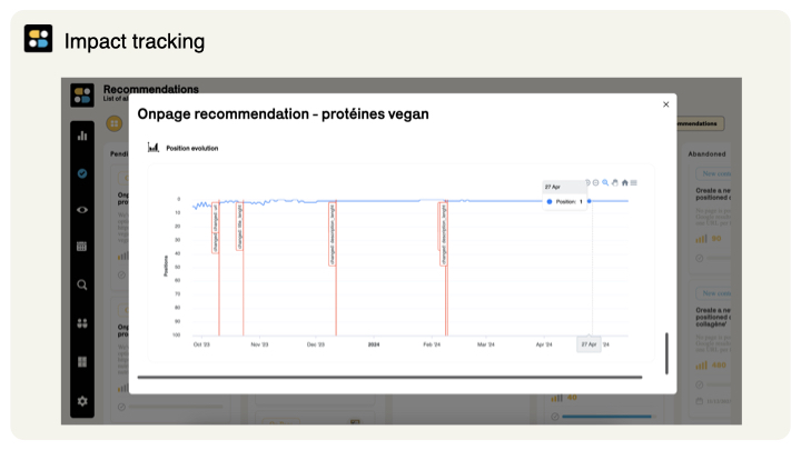 Es hilft Ihnen, Ihre SEO-Prioritäten basierend auf Ihrer personalisierten semantischen Analyse und Konkurrenz zu verwalten. Die Software empfiehlt die Maßnahmen mit der besten Wirkung (technisch, Inhalt und Autorität) und erkennt deren Umsetzung, sodass Sie die konkreten Ergebnisse Ihrer Bemühungen verfolgen können.