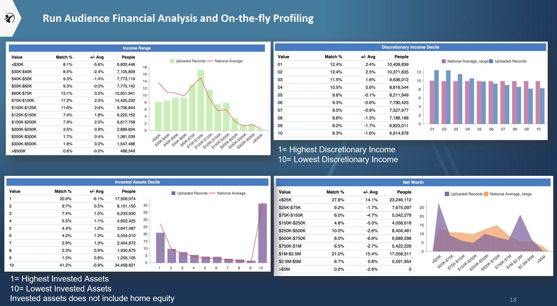 - Fügen Sie IDs, Demografien, Firmografien, NPIs, B2B2C-Verknüpfungen, Geräte und hochpräzise Standortintelligenz zu CRM- und Zielgruppen-Dateien hinzu.