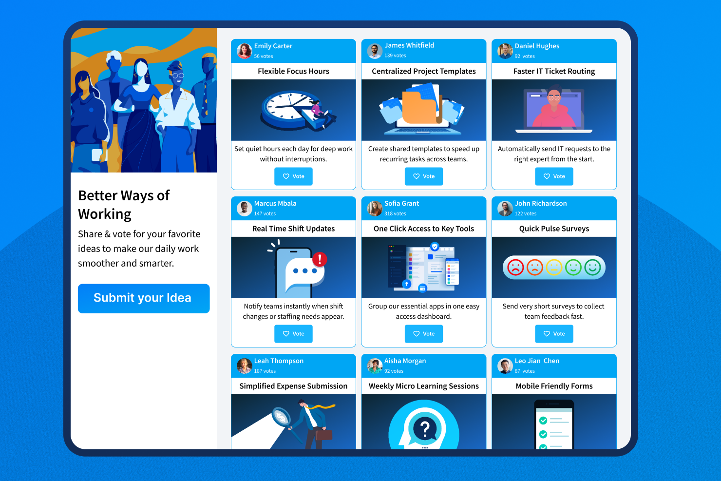 Gamification, Anerkennungsnachrichten, Punkte, Bestenlisten und Belohnungen sind nativ in die Plattform integriert. Diese Funktionen helfen, Beiträge hervorzuheben, Mitarbeiter zu motivieren und das Engagement zu stärken, ohne die operative Komplexität für Ihre Teams zu erhöhen.