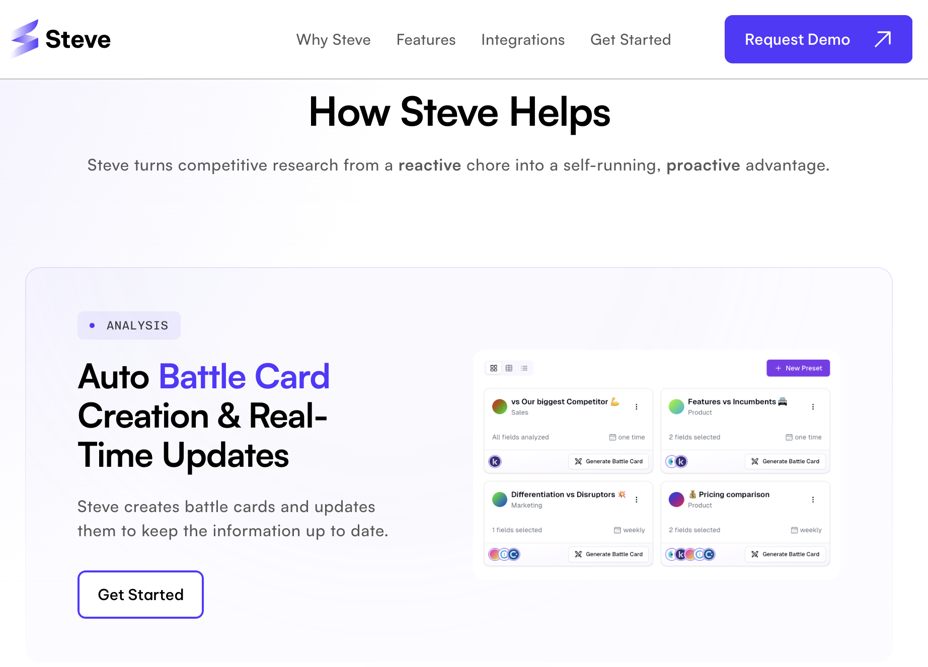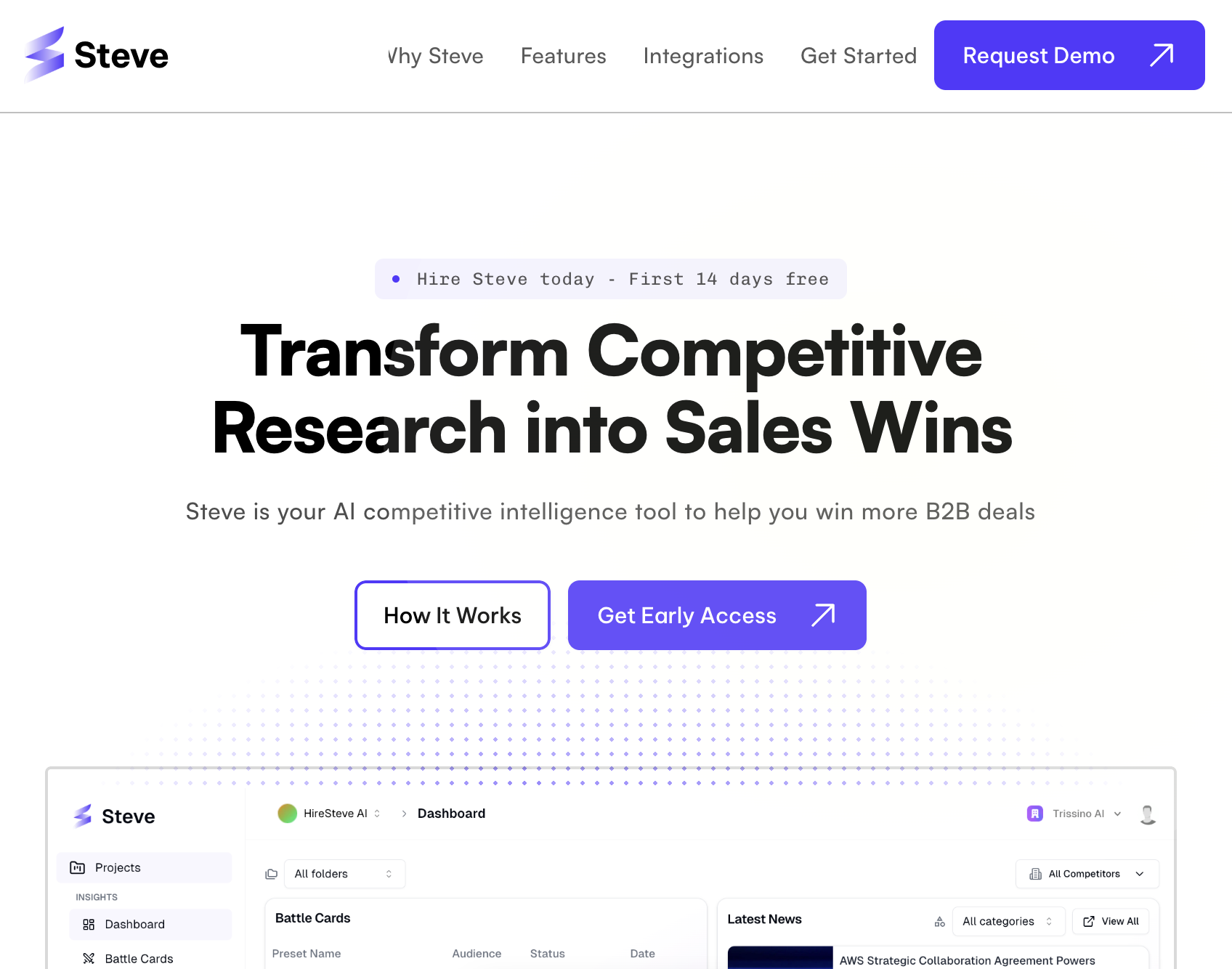 Ich bin wirklich beeindruckt von Steve. Es nimmt den Kopfschmerz aus der Verfolgung von Wettbewerbern, indem es automatisch Updates zu Messaging, Preisen und Funktionen zusammenstellt. Die Einblicke erscheinen direkt in Slack, was super praktisch ist. Was mir am meisten gefällt, ist, dass es einem tatsächlich hilft, auf die Informationen zu reagieren, anstatt sie nur anzusehen. Es fühlt sich mehr wie ein Teamkollege als ein Werkzeug an. Selbst in der Beta-Phase war es schon sehr solide. Bewertung gesammelt von und auf G2.com gehostet.