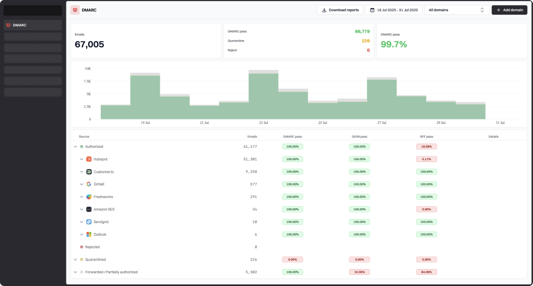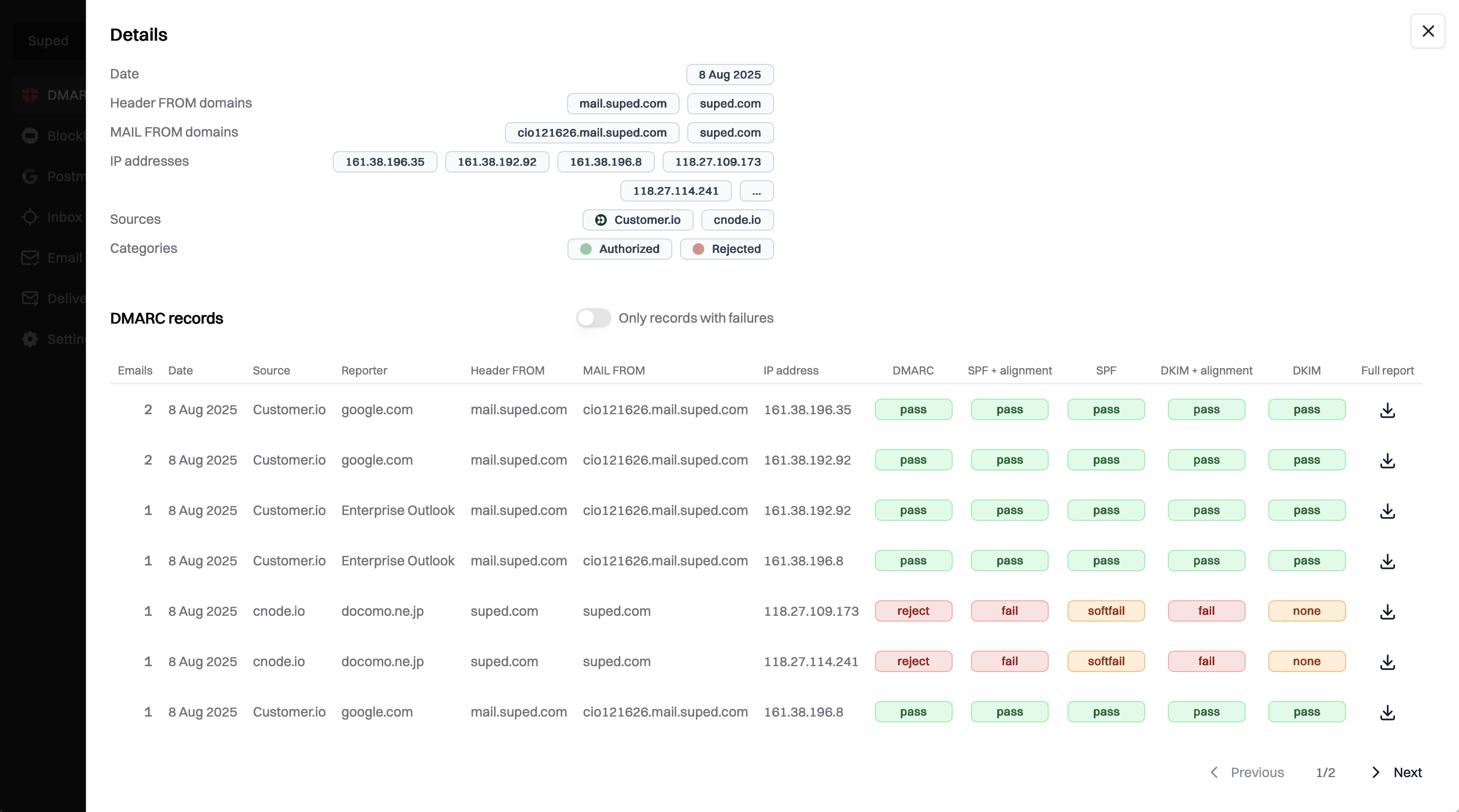 Suped ist eine leistungsstarke und benutzerfreundliche DMARC-Überwachungsplattform, die entwickelt wurde, um die E-Mail-Authentifizierung zu entmystifizieren und Ihre Domain zu sichern. Wir bieten eine vollständige Lösung, die Sie in die Lage versetzt, die volle Kontrolle über Ihr E-Mail-Ökosystem zu übernehmen, Ihren Markenruf zu schützen und sicherzustellen, dass Ihre legitimen E-Mails immer den Posteingang erreichen.