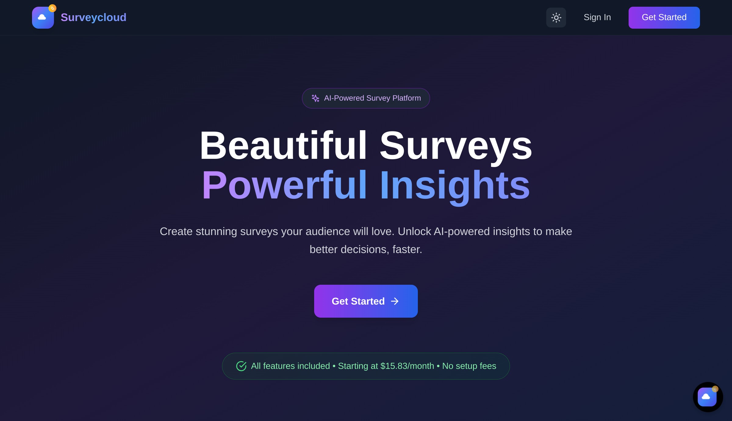 Surveycloud's dashboard provides a streamlined overview of all your surveys with clear status indicators, response counts, and one-click actions for editing, sharing, and viewing analytics. The clean, organized layout makes it easy to manage multiple surveys at once, with intuitive navigation and...