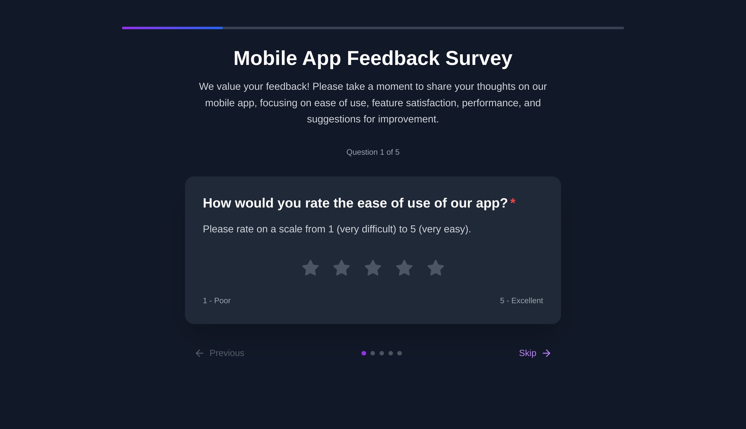 Surveycloud's survey-taking interface features a beautiful, distraction-free design with smooth question transitions and a progress bar that keeps respondents engaged throughout the survey. The mobile-optimized layout ensures perfect readability and easy interaction on any device, while thoughtfu...