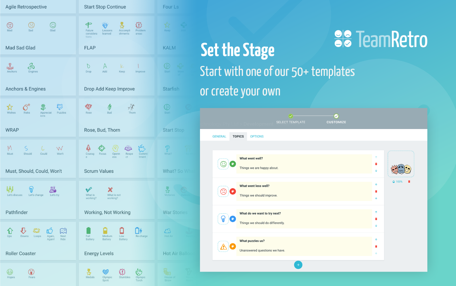 - TeamRetro erkennt, dass Retrospektiven nicht nur für Entwicklungsteams sind und erfordert daher keine Arbeits-E-Mail für die Kontoerstellung und hat Vorlagen, die in jedem Team verwendet werden können (Marketing, Vertrieb, Krankenschwestern, Bankangestellte, Freiwilligengruppe, etc.)