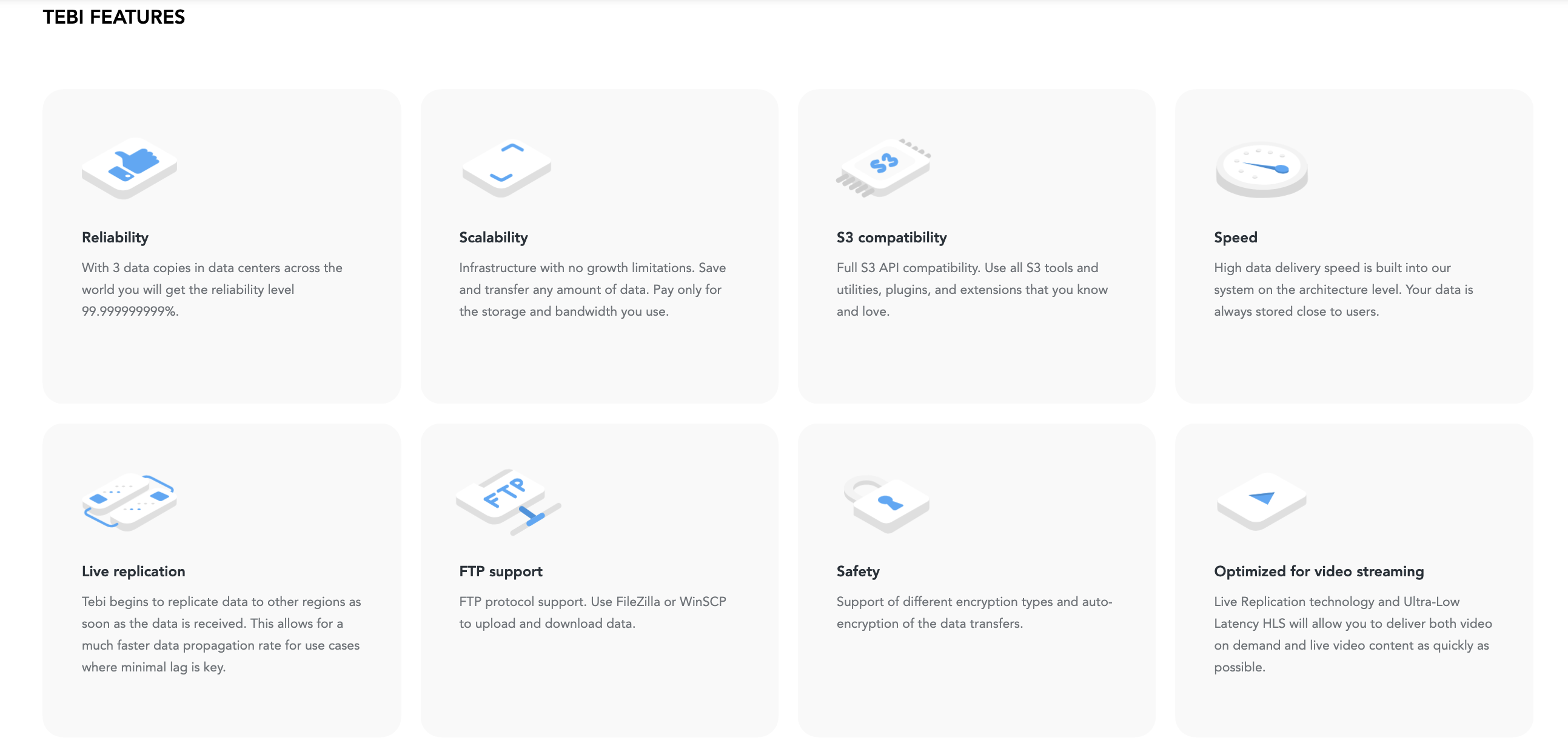 - Eine der besten Eigenschaften von Tebi ist das Dateiübertragungsprotokoll mit einer fantastischen Geschwindigkeit und Zuverlässigkeit der Daten. Darüber hinaus sind die Daten gesichert und werden mühelos auf dem Zielserver verfügbar sein. Bewertung gesammelt von und auf G2.com gehostet.