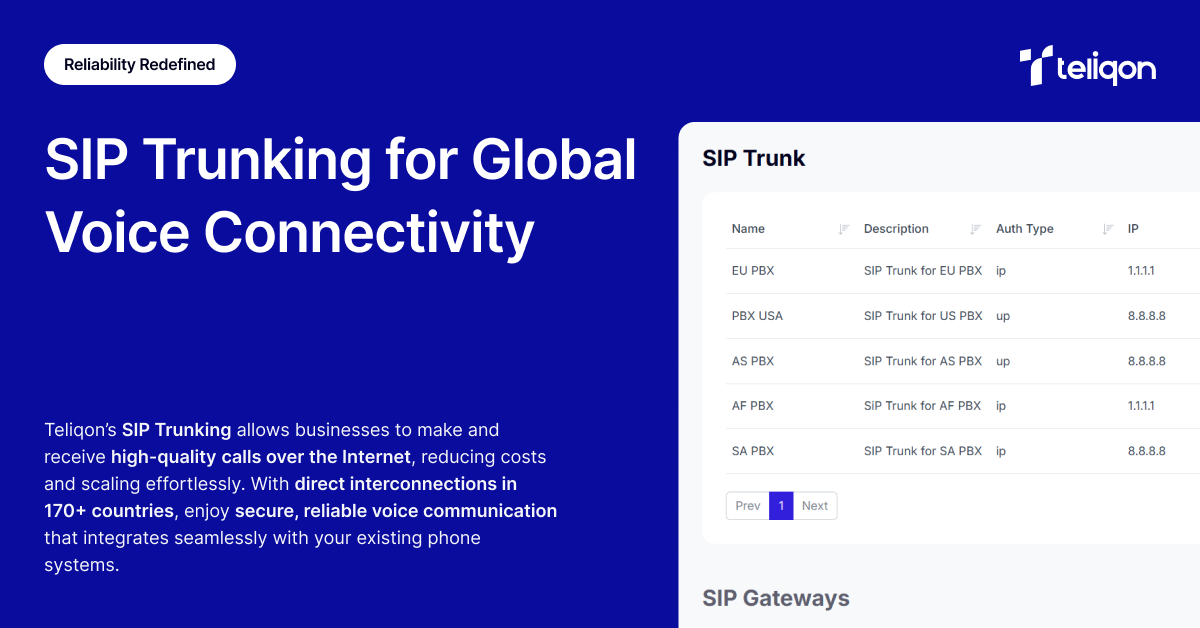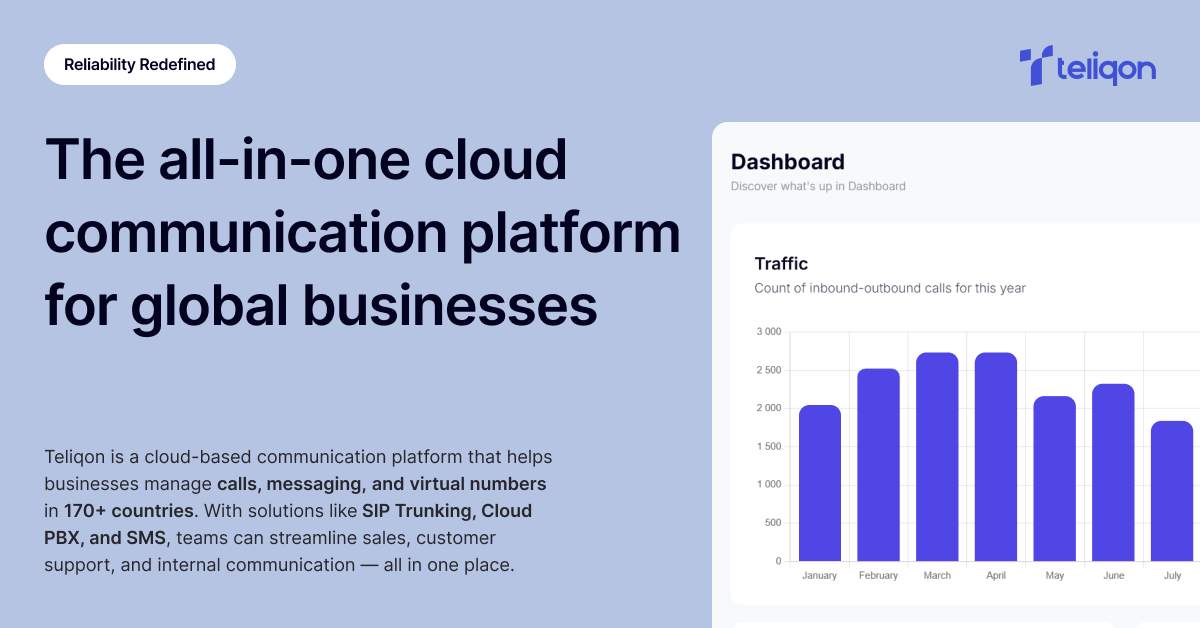 Teliqon ist ein zuverlässiger Anbieter von Kommunikationslösungen, der innovative Dienste wie SIP-Trunking, DID-Nummern, Cloud-PBX, SMS-Lösungen und andere Werkzeuge anbietet, die darauf ausgelegt sind, die Kommunikation in den Bereichen Kundensupport, Vertrieb und Marketing für Unternehmen jeder Größe zu verbessern.