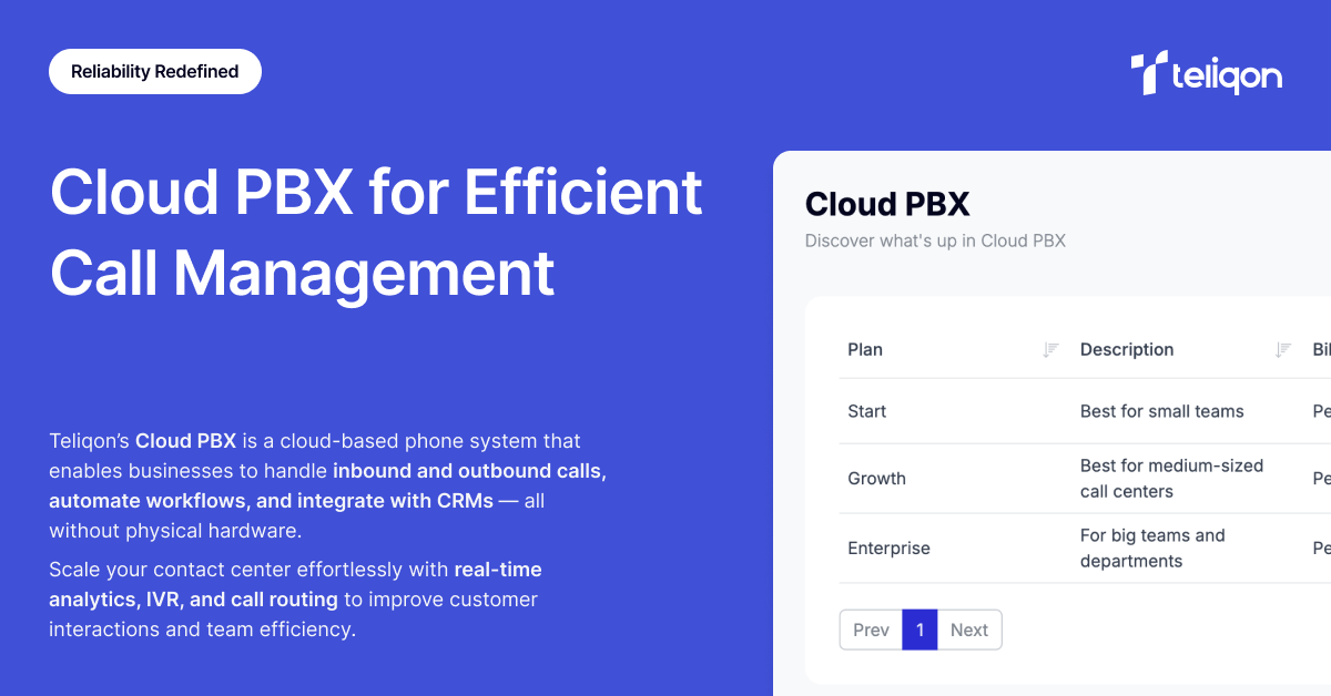 Teliqons Cloud-PBX ermöglicht es Unternehmen, hohe Anrufvolumina effizient zu bewältigen, indem Echtzeitanalysen, Anrufaufzeichnungen, IVR-Systeme und nahtlose CRM-Integration angeboten werden. Verwalten und skalieren Sie Ihr Callcenter mit Teliqons Cloud-PBX, die für optimale Leistung und Benutzerfreundlichkeit entwickelt wurde.