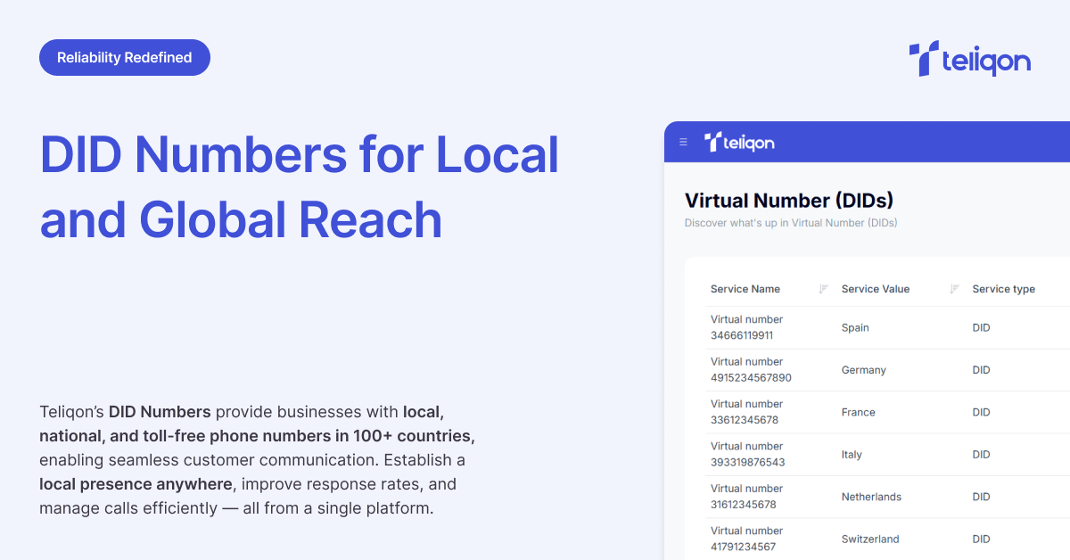 Erreichen Sie Kunden über Teliqons lokale DID-Nummern, steigern Sie die Antwortraten, die globale Konnektivität und bauen Sie Vertrauen in über 100 Ländern auf. Lokale Nummern helfen, Kundenvertrauen aufzubauen und Kosten zu senken. Unser intuitives Benutzerportal vereinfacht die Nummernverwaltung, während fortschrittliche Anrufanalysen und nahtloser API-Zugang die Effizienz und Kostenkontrolle maximieren.