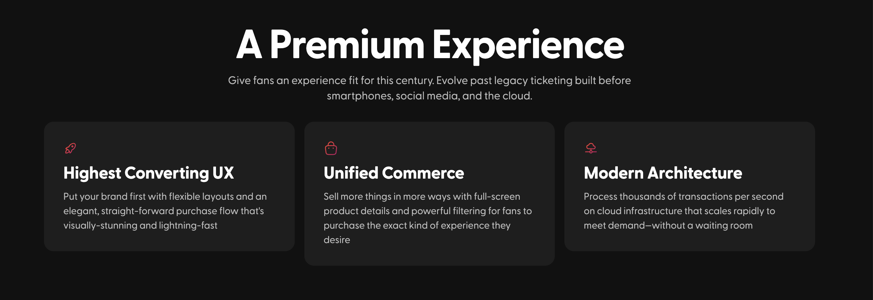 Give fans an experience fit for this century. Evolve past legacy ticketing built before smartphones, social media, and the cloud.