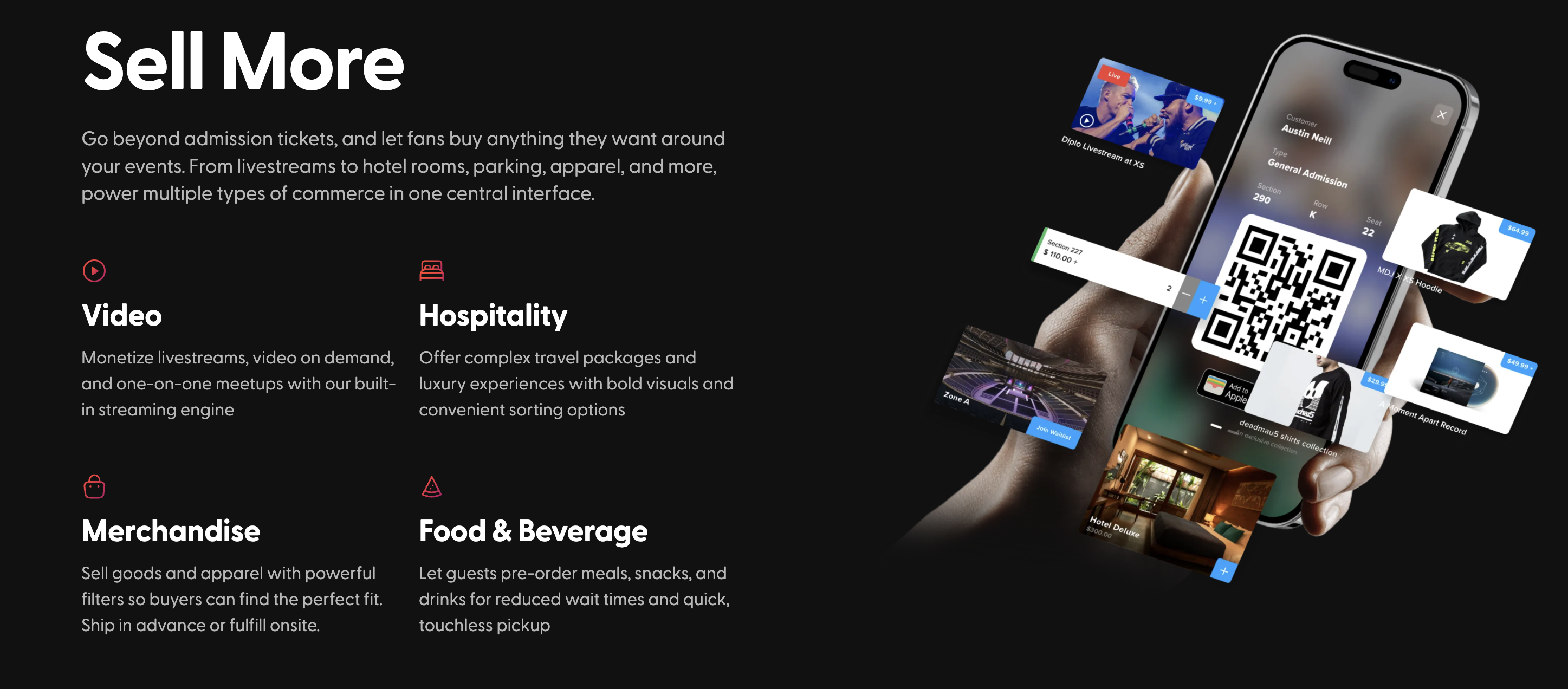Go beyond admission tickets, and let fans buy anything they want around your events. From livestreams to hotel rooms, parking, apparel, and more, power multiple types of commerce in one central interface.
