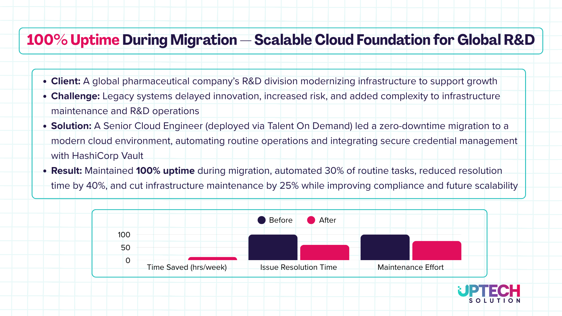 UpTech hat es unglaublich einfach gemacht, unsere Ingenieurskapazität zu skalieren. Innerhalb weniger Tage hatten wir DevOps-Experten, die bereits geprüft und einsatzbereit waren. Die Mischung aus Onshore und Offshore gab uns die Geschwindigkeit, die wir zu einem überschaubaren Preis benötigten. Bewertung gesammelt von und auf G2.com gehostet.