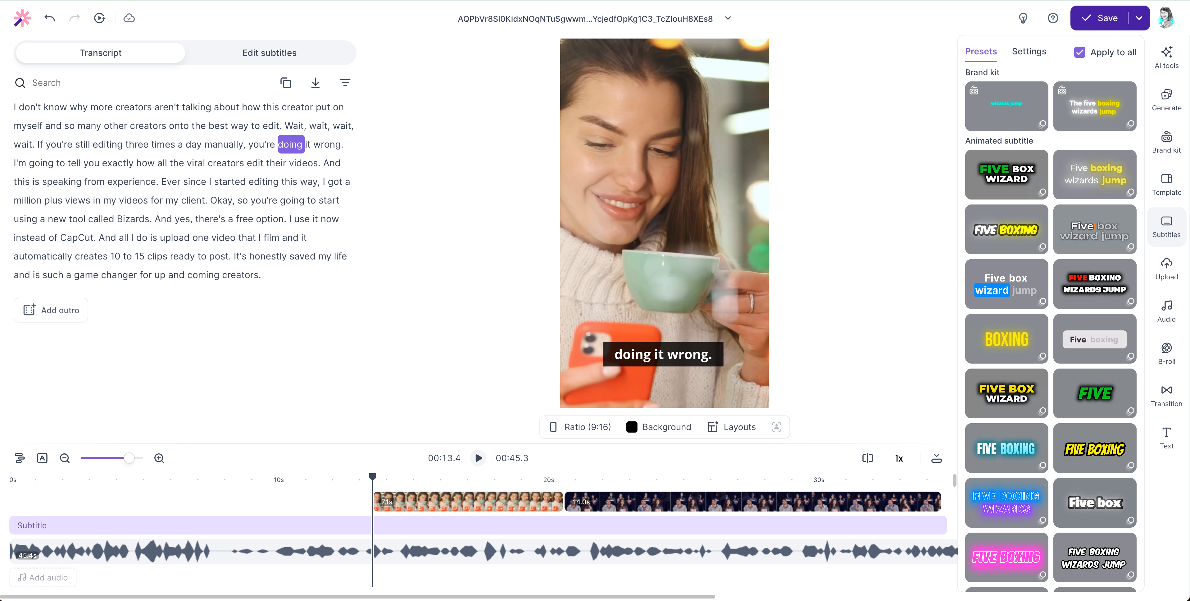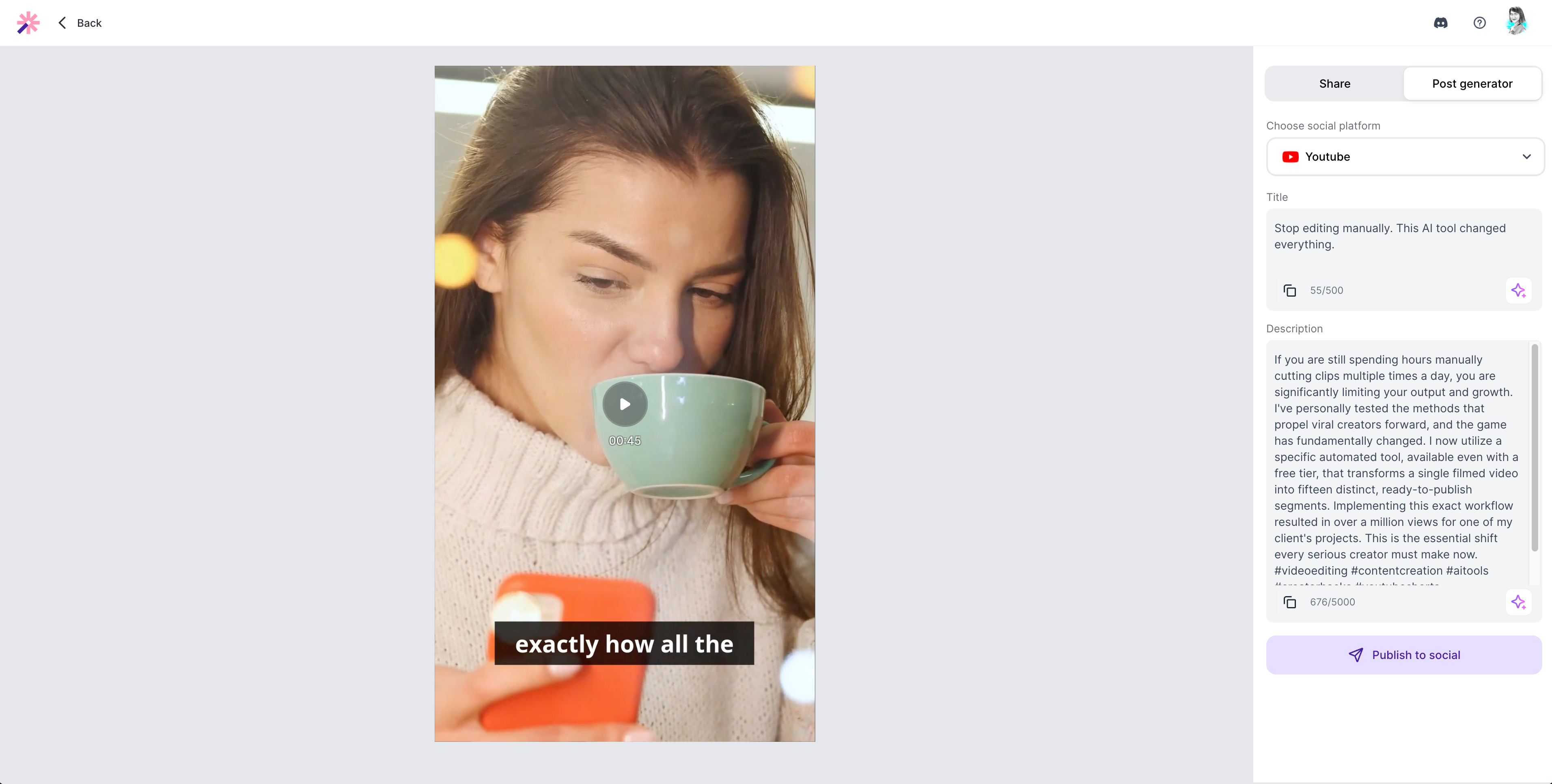 Darüber hinaus integriert Vizard KI-generierte Emojis und B-Roll, um Videos visuell zu bereichern und sie ansprechender und fesselnder zu machen. Die AI Social Captions-Funktion generiert Untertitel, die für verschiedene soziale Medienalgorithmen optimiert sind, was die Wahrscheinlichkeit erhöht, dass Inhalte entdeckt werden. Benutzer können auch von dem integrierten Content-Kalender profitieren, der die Verbindung von bis zu 20 Konten über mehrere Plattformen hinweg ermöglicht und die nahtlose Planung und Terminierung von Inhalten direkt innerhalb von Vizard erleichtert.