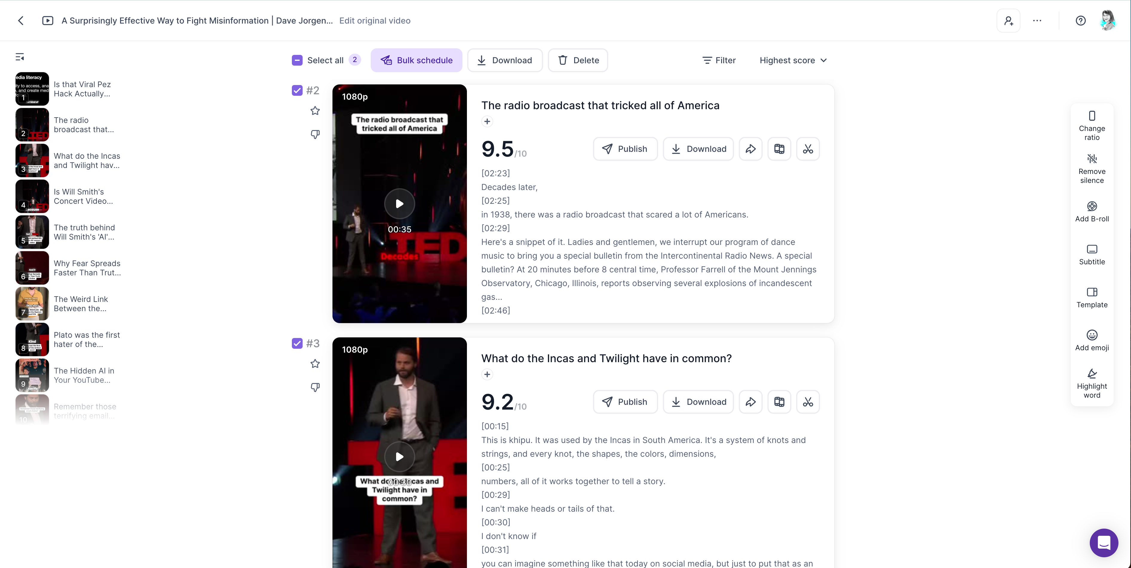 Die wichtigsten Funktionen von Vizard sind darauf ausgelegt, das Videoerlebnis zu verbessern. Die AI Clipping-Funktion ermöglicht es Benutzern, mit einem einzigen Klick schnell Highlights in ihrem Filmmaterial zu identifizieren, um sicherzustellen, dass die fesselndsten Momente hervorgehoben werden. Darüber hinaus generiert das AI Dynamic Captioning-Tool dynamische Untertitel in 32 Sprachen, wodurch Videos einem globalen Publikum zugänglich gemacht werden. Die AI Speaker Detection und Auto-Reframe-Funktionen verfolgen und zentrieren intelligent wichtige Subjekte, was das gesamte Seherlebnis verbessert.