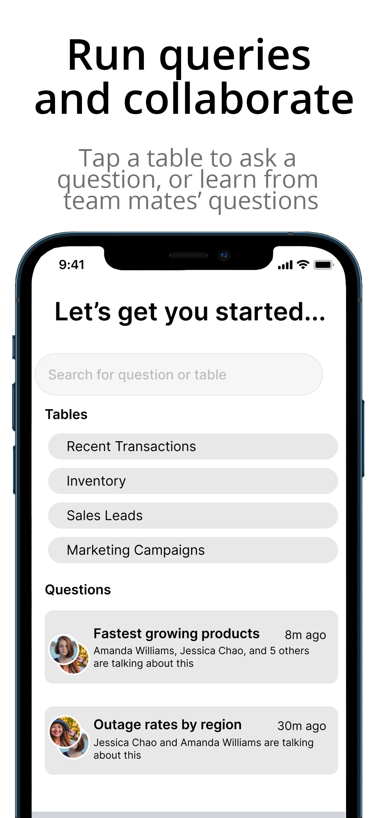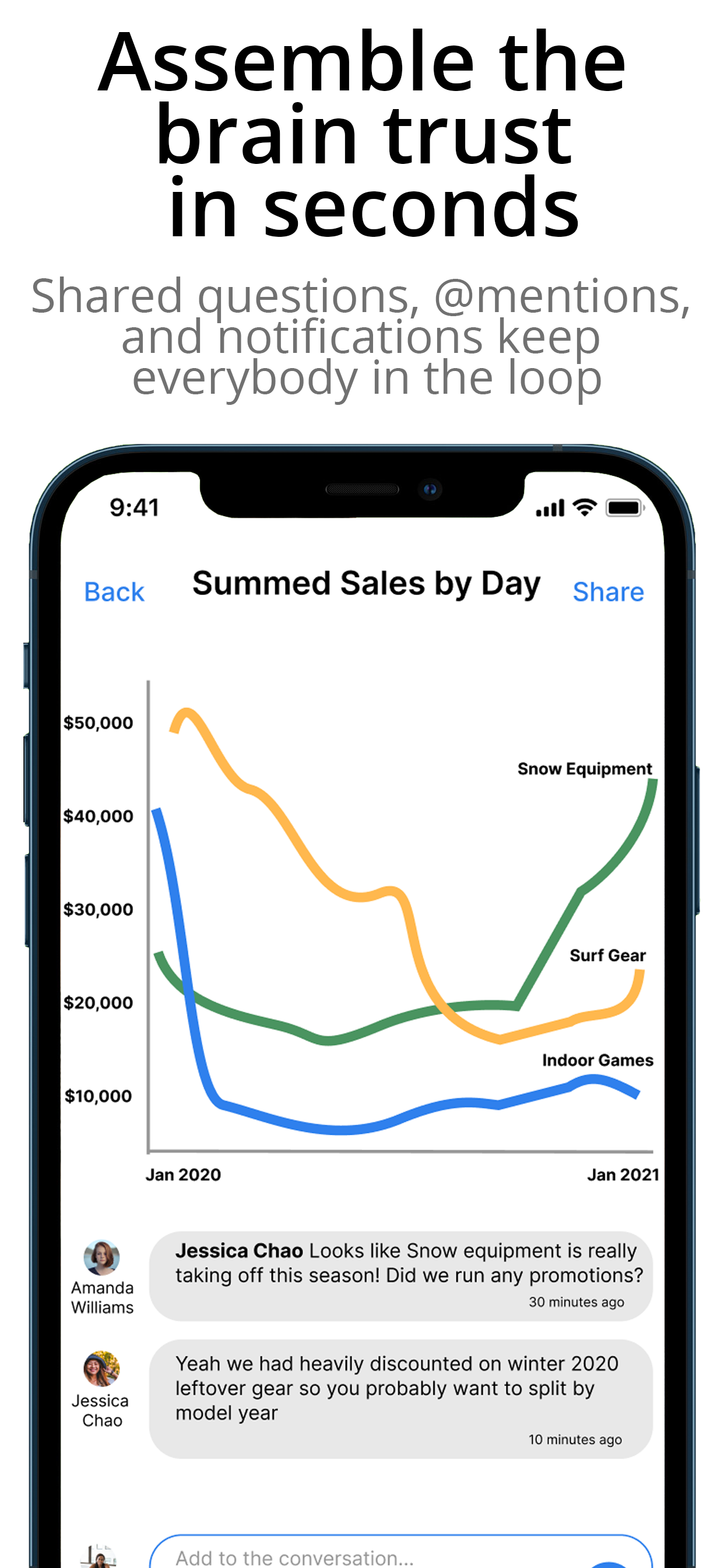 - Kollaborative Werkzeuge: Teilen Sie Fragen, verwenden Sie @Erwähnungen und beteiligen Sie sich an gemeinsamen Chats, um Teamarbeit zu fördern und Daten im gesamten Unternehmen nutzbar zu machen.