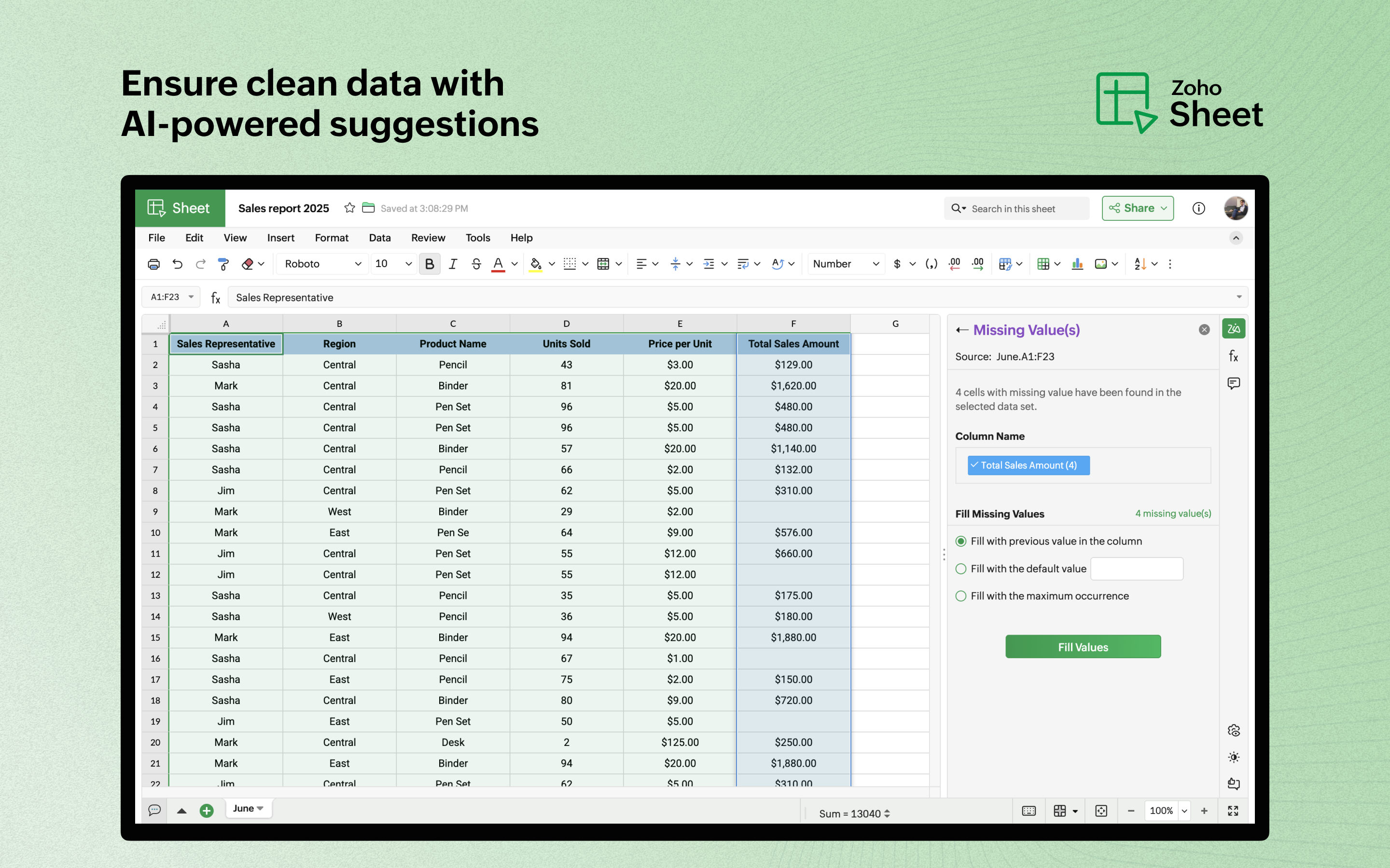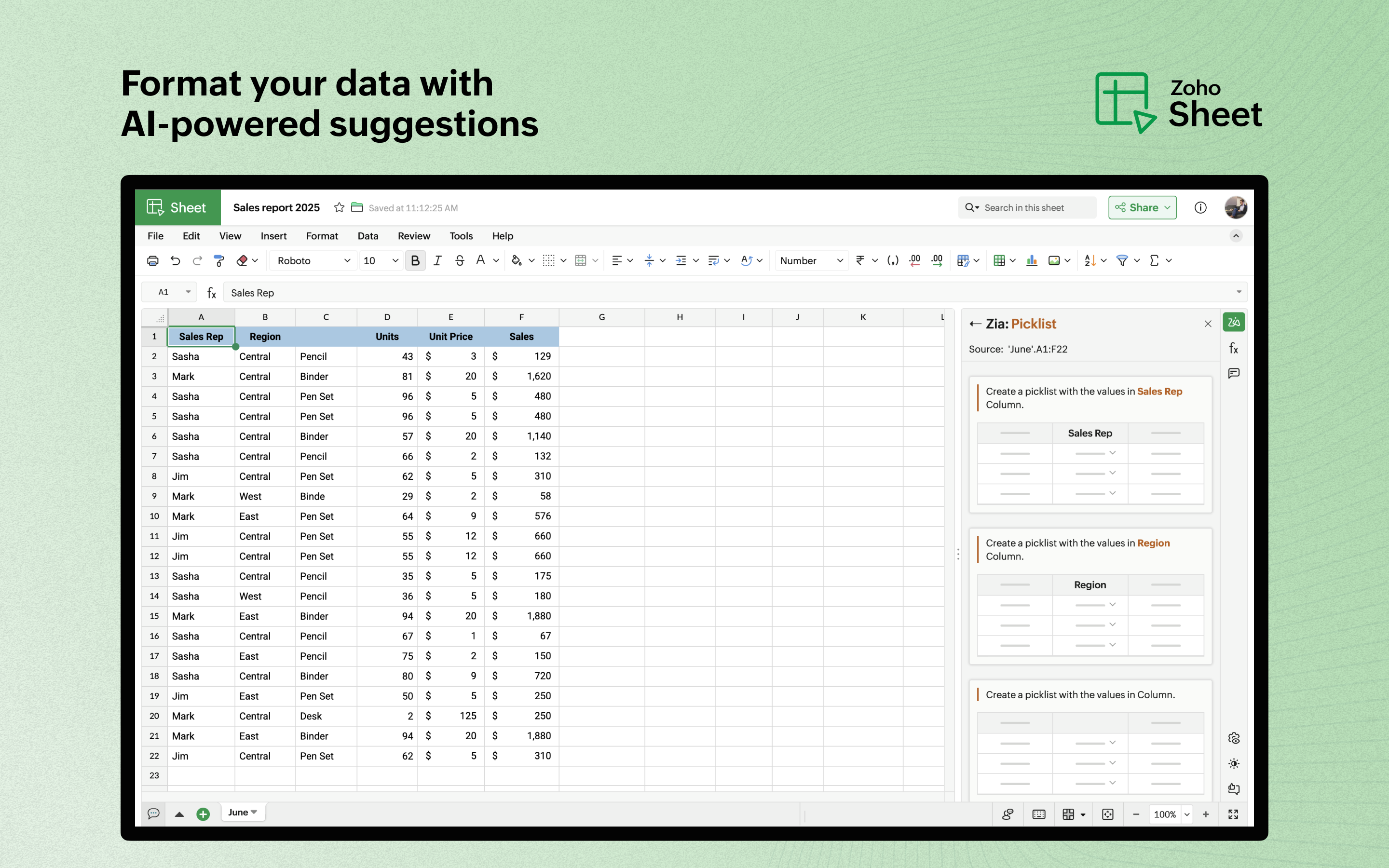 Ich finde Zoho Sheet unglaublich wertvoll wegen seiner nahtlosen Integration mit anderen Zoho-Produkten, was meinen Arbeitsablauf erleichtert, indem alle Daten auf einer einzigen Plattform zugänglich sind. Seine Kompatibilität mit bekannten Programmen wie Microsoft Excel macht den Übergang reibungslos und die Nutzung intuitiv, was zur Benutzerfreundlichkeit beiträgt. Ich schätze die Versionskontrollfunktion, die eine hervorragende Verwaltung der Dateien bietet und das Abrufen früherer Versionen mühelos macht. Außerdem war die anfängliche Einrichtung sehr schnell, und es ist eine Erleichterung, eine solche Effizienz bei der Bereitstellung zu haben. Insgesamt stechen die Kombination dieser Funktionen und die effektiven Kollaborationsmöglichkeiten als beeindruckende Aspekte von Zoho Sheet hervor. Bewertung gesammelt von und auf G2.com gehostet.