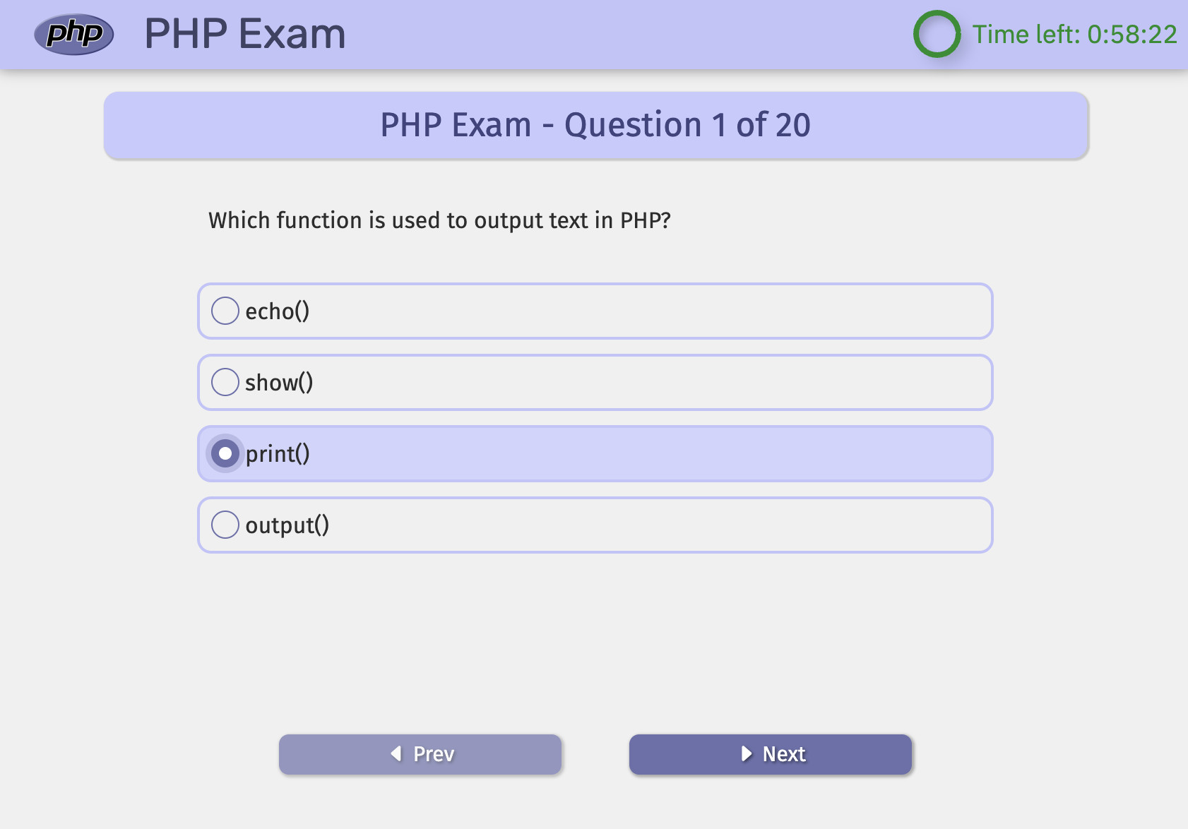 Askium’s online exam interface displaying a timed PHP knowledge test with multiple-choice questions. The clean layout, progress tracking, and navigation buttons help candidates focus on the assessment while allowing examiners to monitor completion time and accuracy.