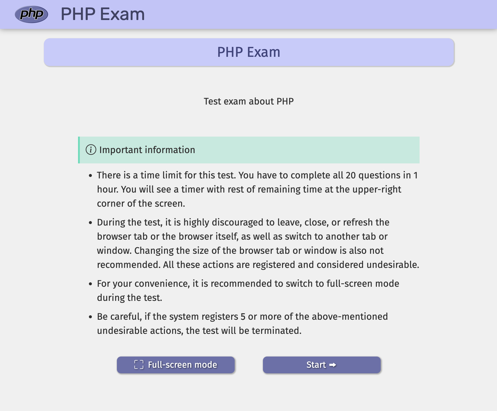 Demo Askium - PHP Online Exam – Instructions Screen in Askium