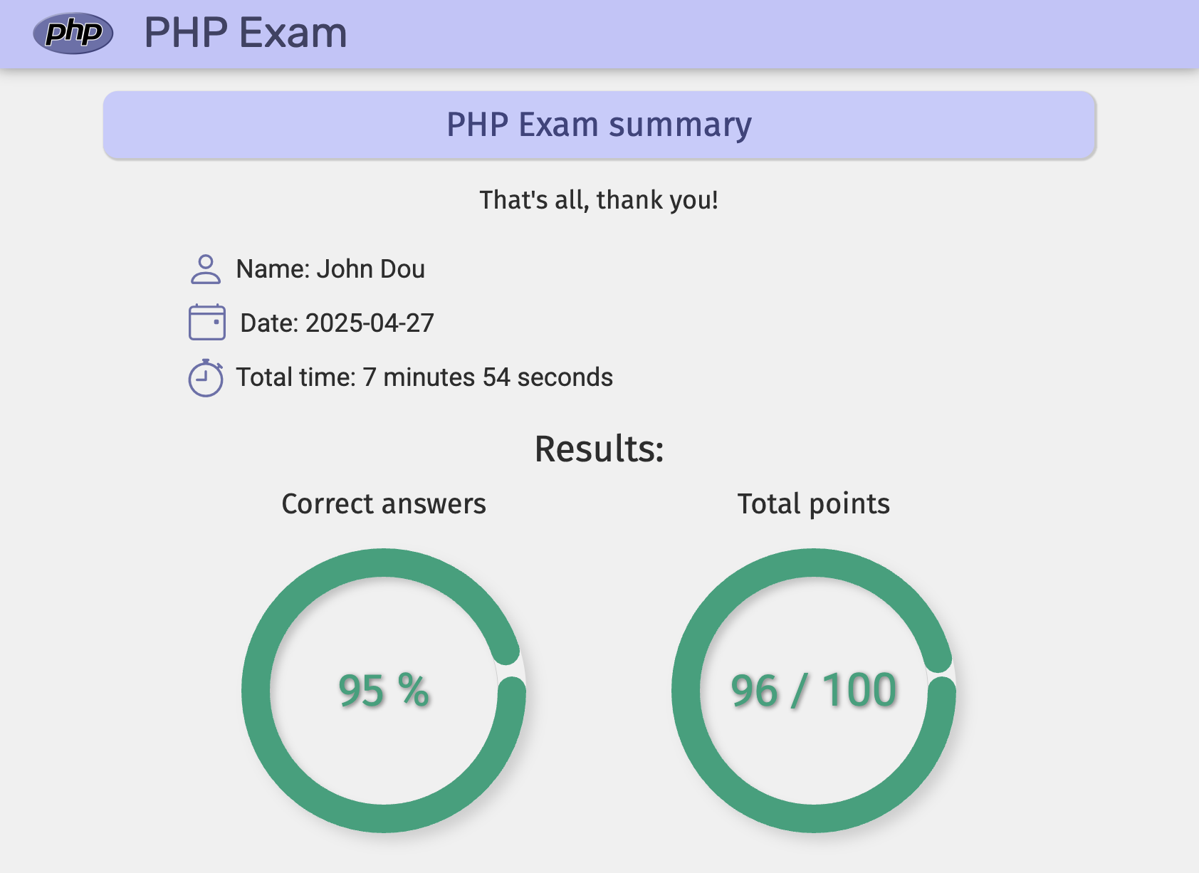 Askium’s exam results screen summarizing candidate performance with key metrics, including completion time, percentage of correct answers, and total score. The clean visual design with progress rings helps both test-takers and examiners quickly assess outcomes and track success rates.
