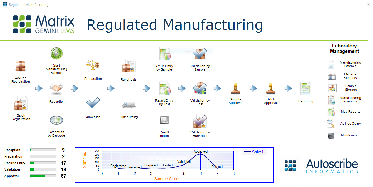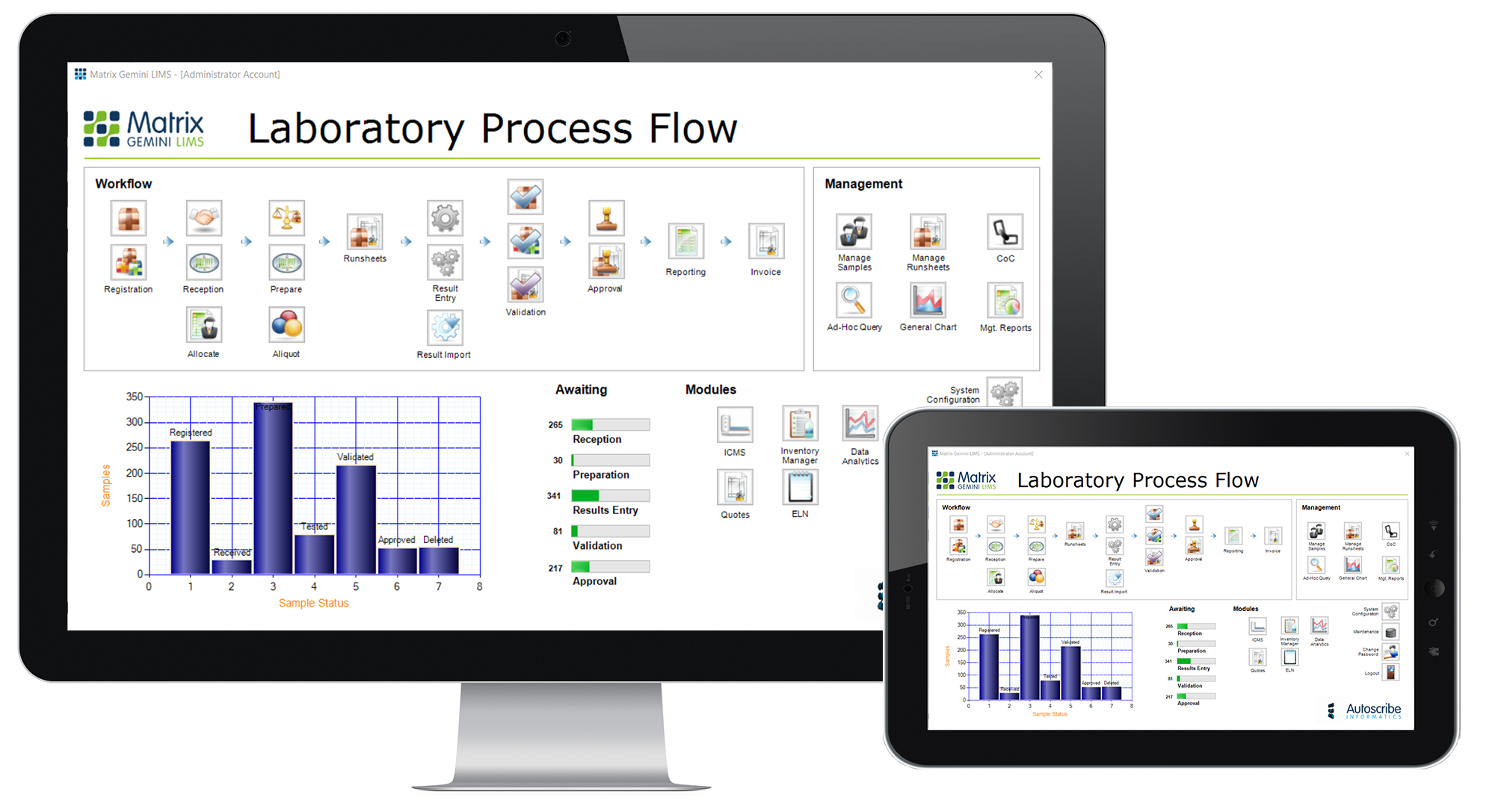 Matrix Gemini LIMS, de Autoscribe Informatics, es un sistema de gestión de información de laboratorio configurable y a prueba de futuro, líder en la industria. Cada pantalla en el flujo de trabajo puede configurarse para coincidir con los requisitos del usuario utilizando las herramientas de configuración integradas.
