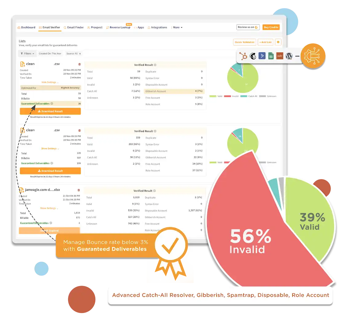 La herramienta de validación de correos de Clearout está diseñada para proporcionar un 99% de precisión al realizar más de 20 verificaciones de validación refinadas para determinar el estado de cada dirección de correo electrónico en sus datos. Con más de 15 millones de direcciones de correo verificadas diariamente, Clearout ayuda a las empresas al identificar prospectos legítimos y eliminar direcciones de correo inválidas como abuso, trampas de spam, errores tipográficos, correos temporales y otros.