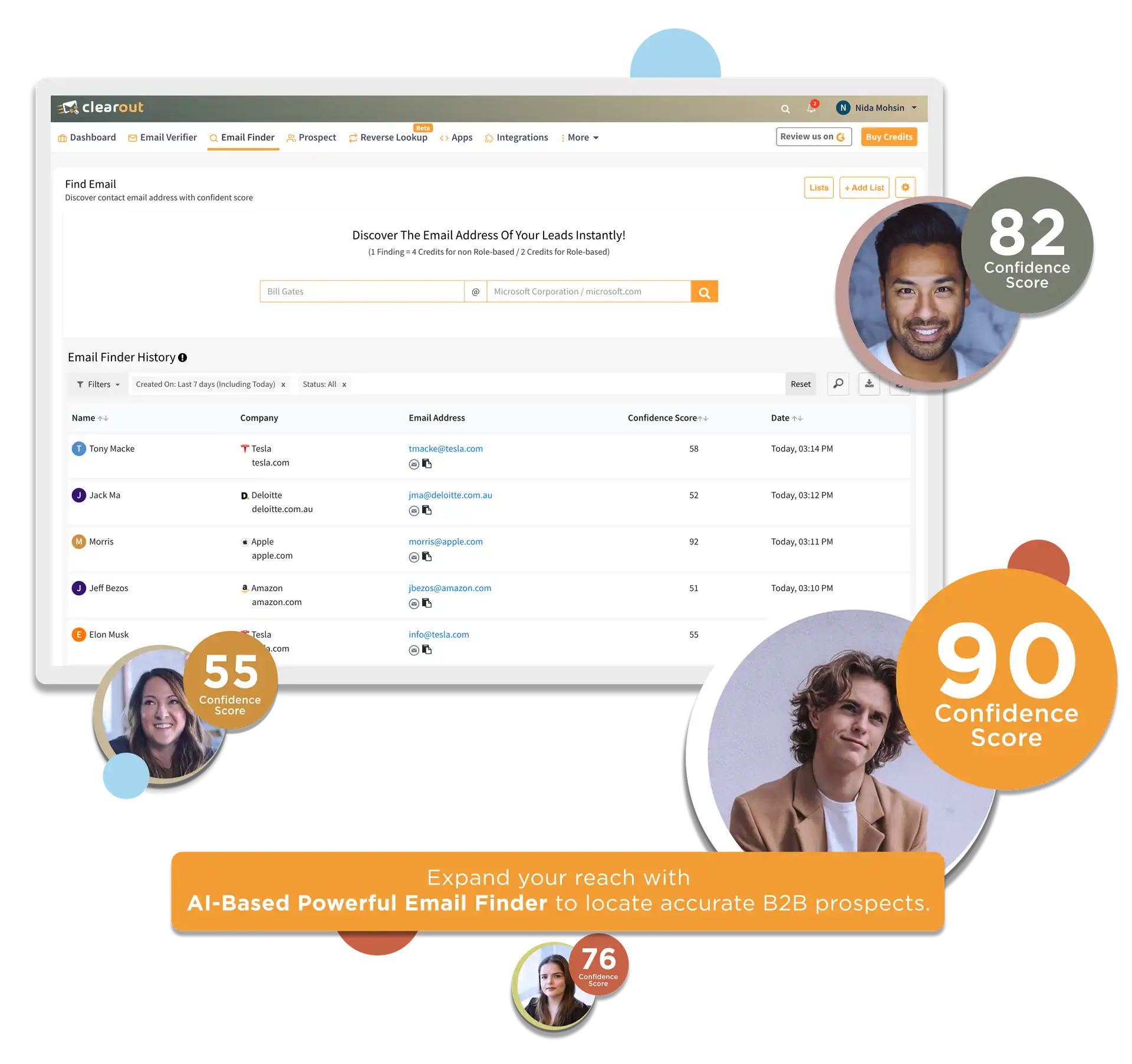 Es difícil construir una lista de ventas y marketing de correos desde cero debido a recursos limitados. Muchas empresas compran listas perfiladas preestablecidas de un tercero y envían correos masivos idénticos. Esto puede poner a su negocio en una posición vulnerable debido a la baja calidad de las listas de correos. Para salvar a su negocio de problemas, Clearout Email Finder proporciona resultados asegurados respaldados con una puntuación de confianza para construir una base de datos de clientes sólida.