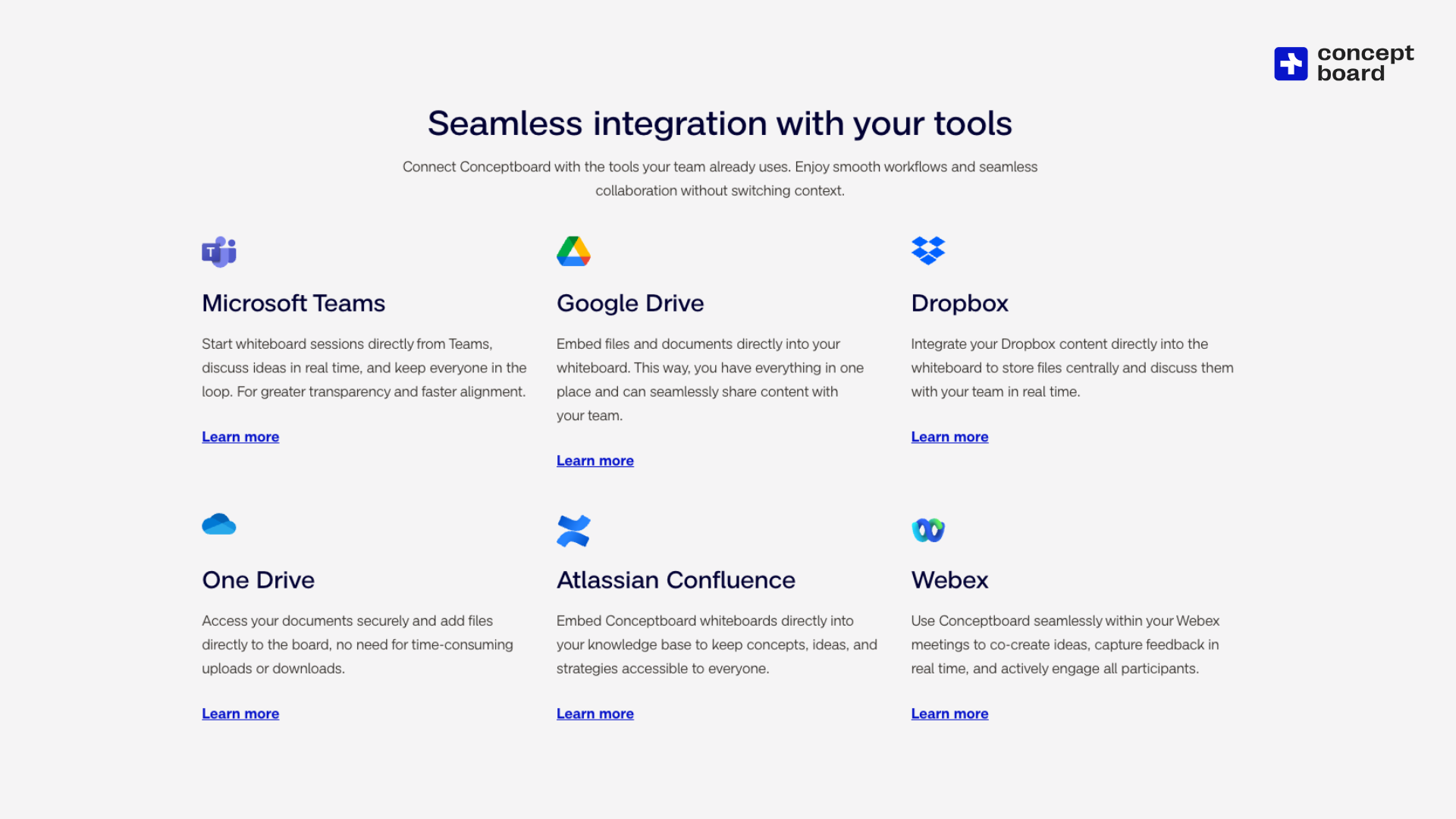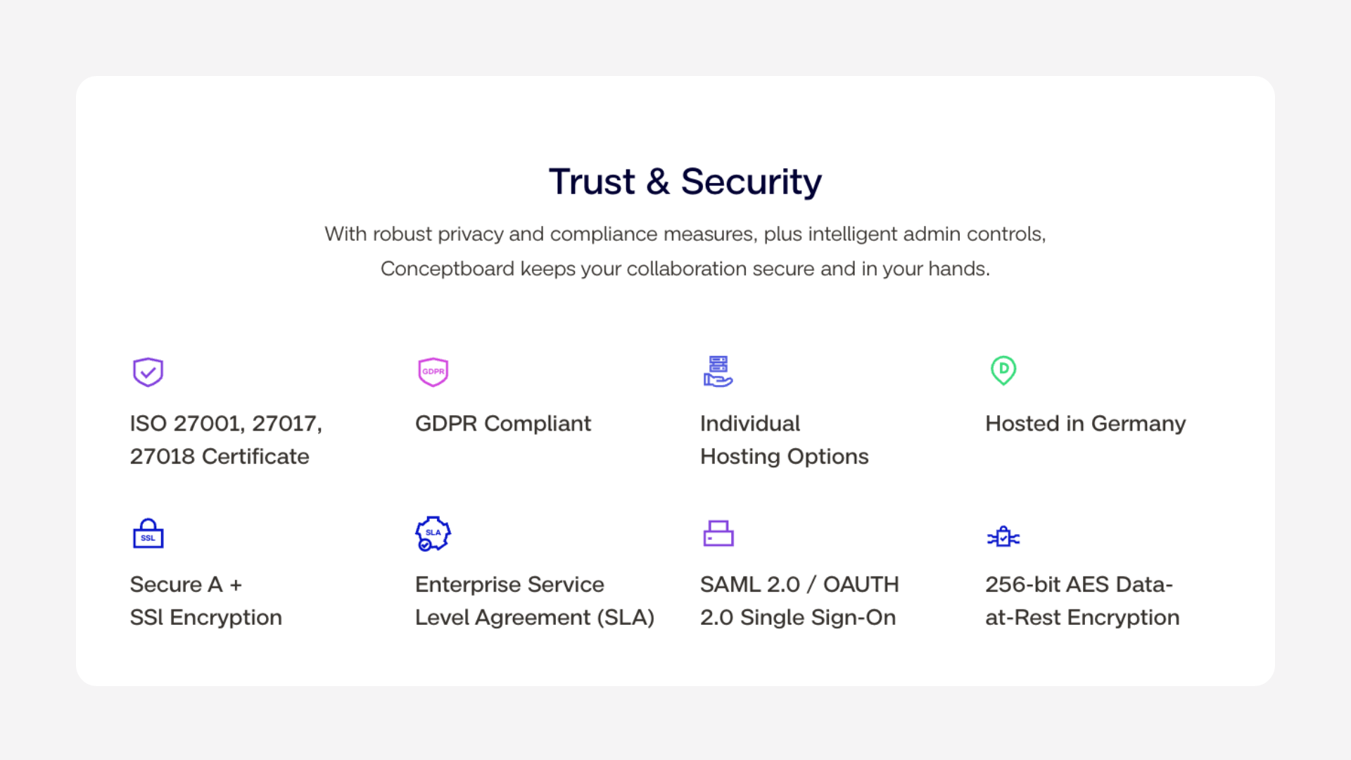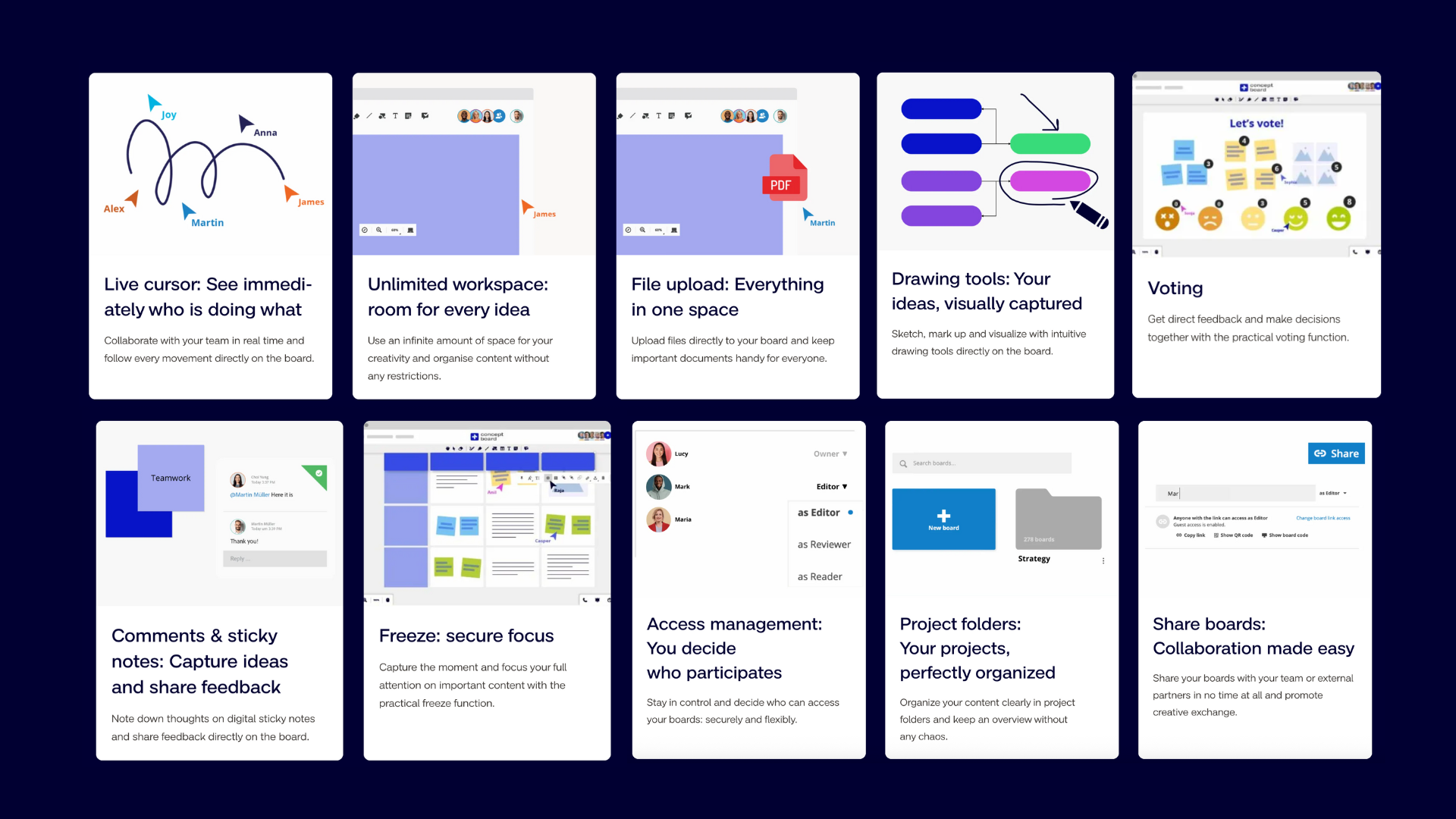 Ocasionalmente, experimenté inestabilidad en las sesiones con clientes cuando los participantes fueron brevemente desconectados o tuvieron que volver a unirse. Esto era molesto en el momento, pero se podía resolver rápidamente. Aparte de eso, realmente me gusta todo. Comparado con otros tableros que probé, Conceptboard es claramente mi número uno, especialmente por su fuerte enfoque en la seguridad de los datos. Reseña recopilada por y alojada en G2.com.