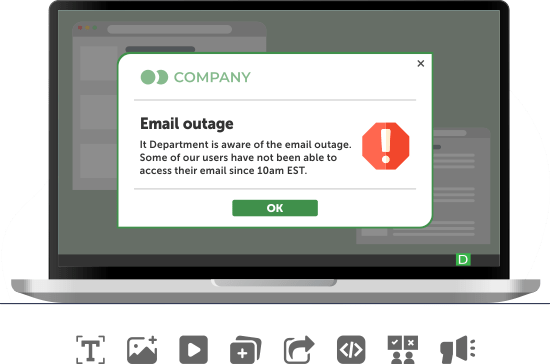Además de emergencias, DeskAlerts también se utiliza para comunicaciones operativas planificadas, como alertas de mantenimiento de TI, actualizaciones de políticas y anuncios internos críticos. Olvídate de las bandejas de entrada saturadas: mantén el control sobre los mensajes.