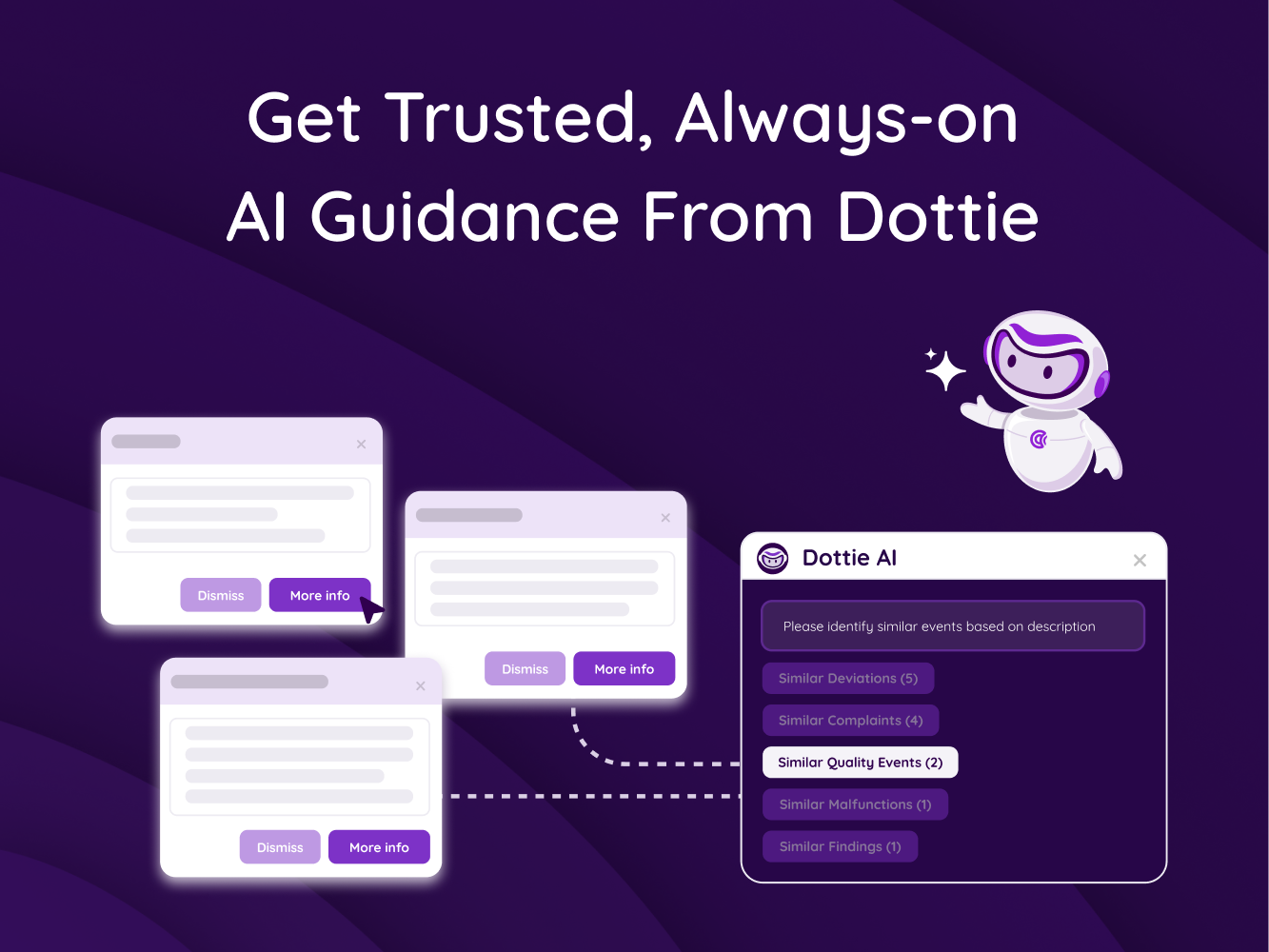 Dot Compliance es el primer eQMS impulsado por IA de la industria, construido para que comiences rápidamente y para brindarte los conocimientos para impulsar la calidad de manera eficiente. Nuestras soluciones están diseñadas para acelerar la innovación segura en las ciencias de la vida, con cobertura de procesos lista para implementar y mejores prácticas al alcance de tu mano. Dot Compliance cumple completamente con 21 CFR parte 11, EU Anexo 11, y apoya ISO 9001, 13485, 14971, y 27001.