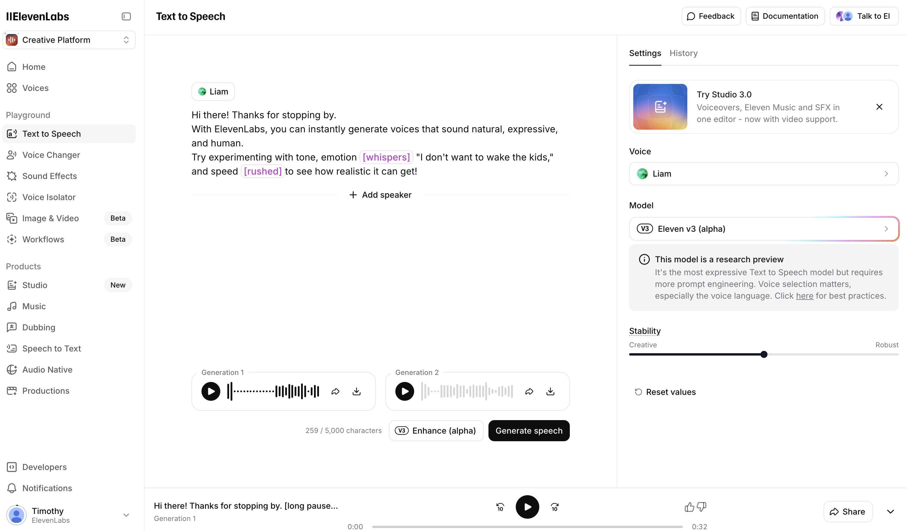 Me encanta absolutamente ElevenLabs por sus excepcionales capacidades de agente de voz, que permiten conversaciones fluidas con los usuarios en mi plataforma. La notable suavidad y baja latencia del agente de voz hacen que la experiencia sea encantadora, a menudo llevando a los usuarios a olvidar que están interactuando con una IA en lugar de un humano. También aprecio la increíble facilidad de integrar ElevenLabs en una aplicación React a través de su SDK. Además, el panel de control es impresionante, permitiéndome editar el agente fácilmente y proporcionando confirmaciones visuales para cada acción. El panel de historial de conversaciones y las analíticas son invaluables, ofreciendo información y datos que ayudan enormemente en la gestión y optimización de las interacciones con los usuarios. Reseña recopilada por y alojada en G2.com.