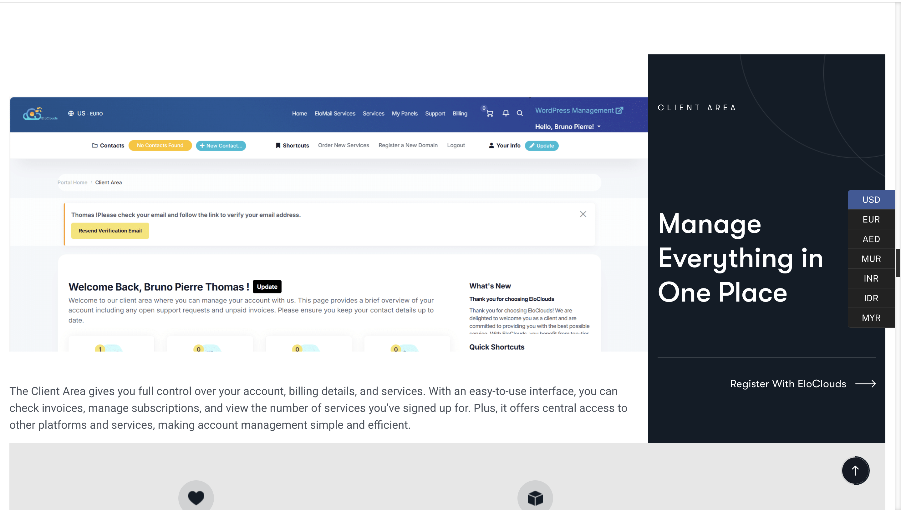 Eloclouds no es solo otro proveedor de alojamiento, es un ecosistema orientado al desarrollador que simplifica operaciones complejas y ofrece un rendimiento de nivel empresarial para todos. Ya sea que estés gestionando múltiples sitios web de clientes como agencia o dirigiendo un negocio de comercio electrónico de alto tráfico, Eloclouds proporciona la velocidad, fiabilidad y personalización necesarias para escalar con confianza.