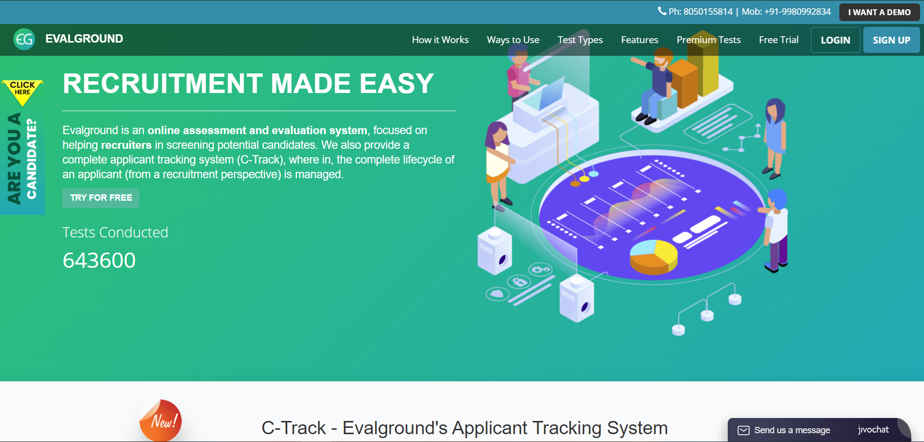 Evalground is an online assessment and evaluation system, focused on helping recruiters in screening potential candidates. We also provide a complete applicant tracking system (C-Track), where in, the complete lifecycle of an applicant (from a recruitment perspective) is managed.
