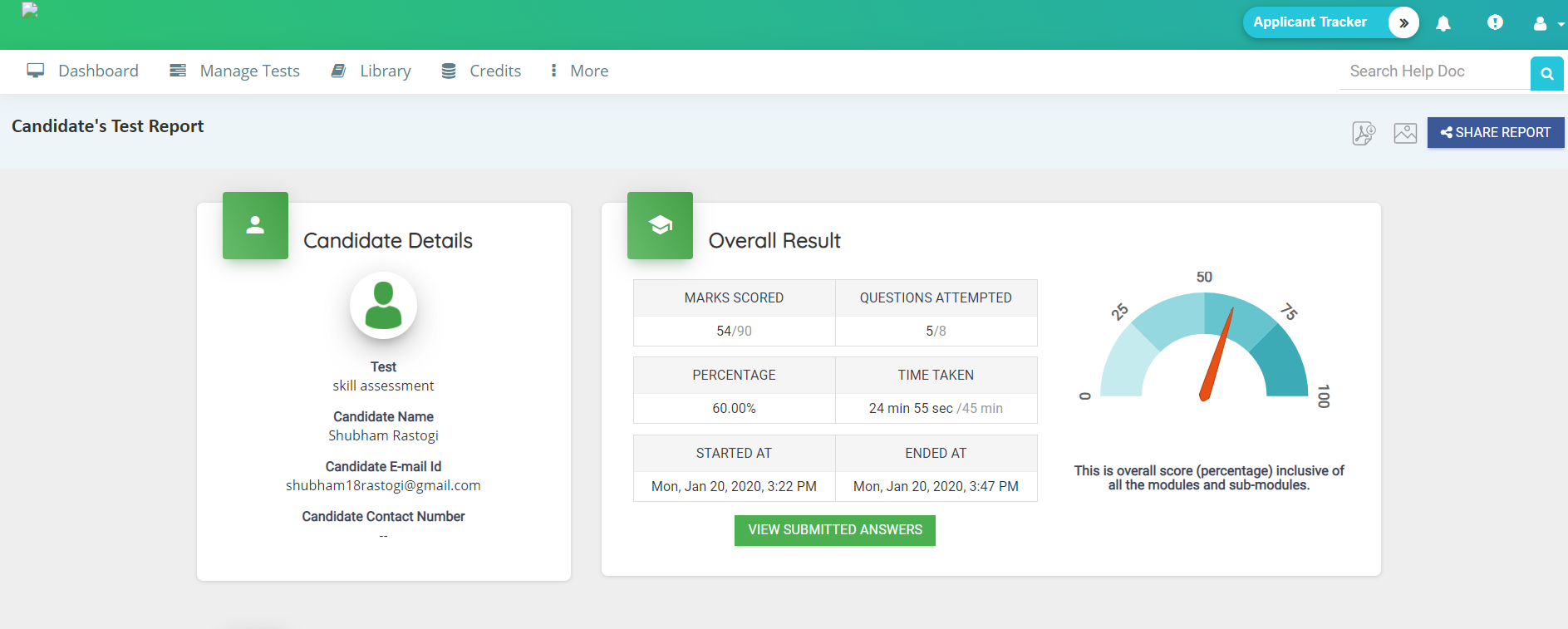 Here you will see detailed analysis of candidate's report, which will explain you the performance of candidate according to the time and topic. You can also share the candidate's report with one click.