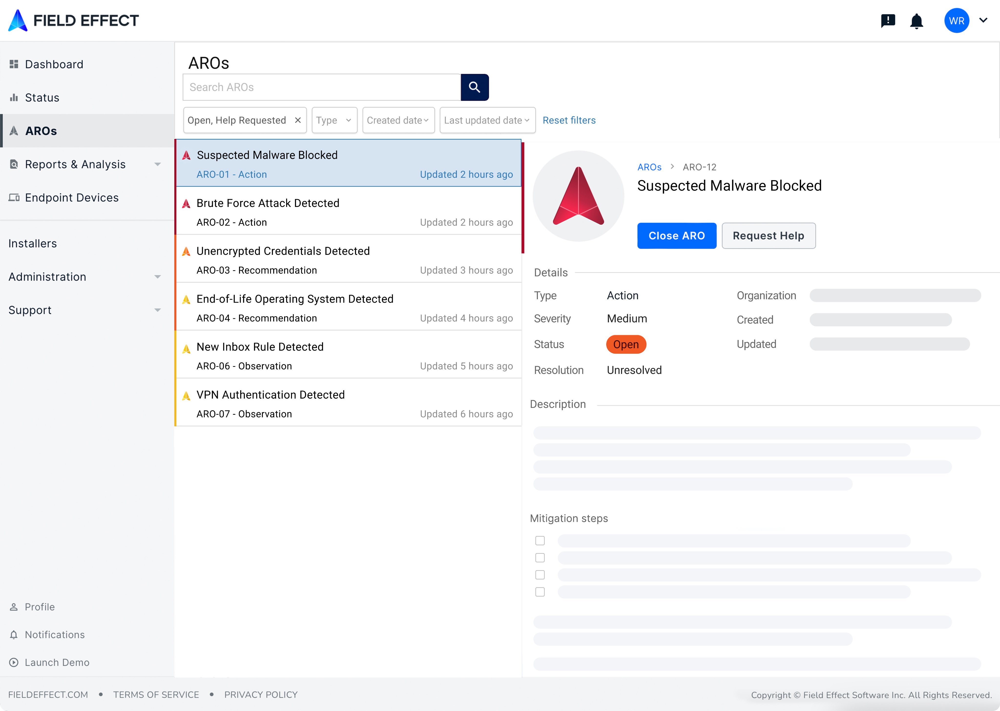 AROs are prioritized alerts in Field Effect MDR that identify, categorize, and guide responses to potential threats in your environment.