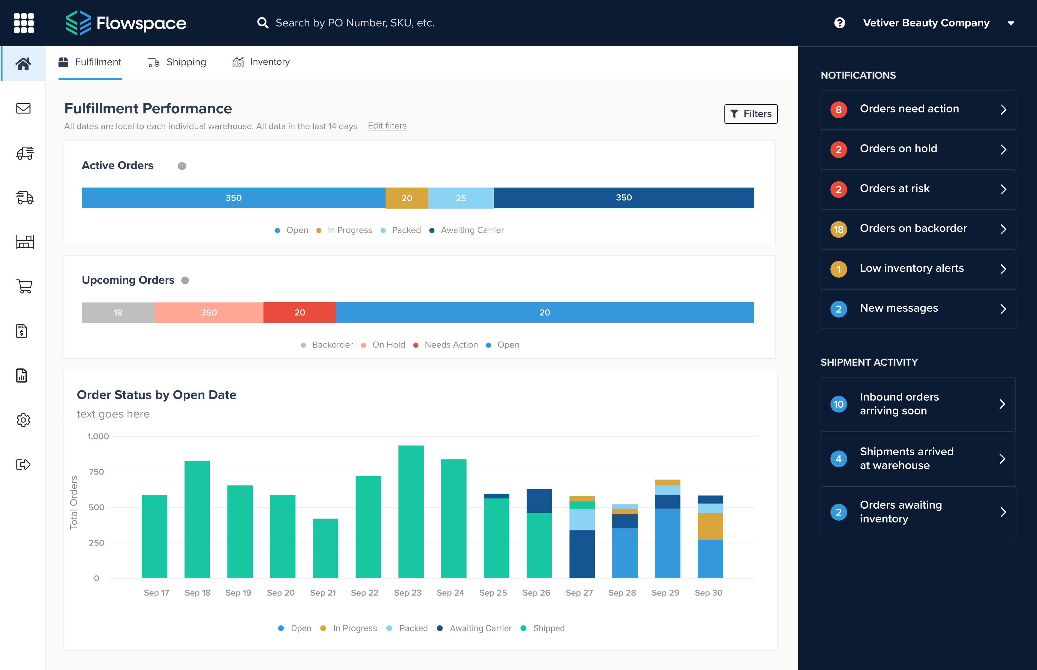 El sistema enruta y redirige inteligentemente los pedidos al centro de cumplimiento más eficiente según la ubicación, disponibilidad de inventario y rendimiento del transportista. Esto reduce los tiempos de tránsito, controla los costos de envío y preserva la velocidad de entrega y la experiencia del cliente. Flowspace se integra con sistemas ERP, software de gestión de almacenes y las principales plataformas de comercio electrónico, asegurando que los datos de inventario, pedidos y envíos permanezcan consistentes en todos los canales de venta. Todas las operaciones están respaldadas por acuerdos de nivel de servicio que garantizan estándares específicos para la precisión de pedidos, envío a tiempo y velocidad de cumplimiento, con informes para responsabilizar el rendimiento.