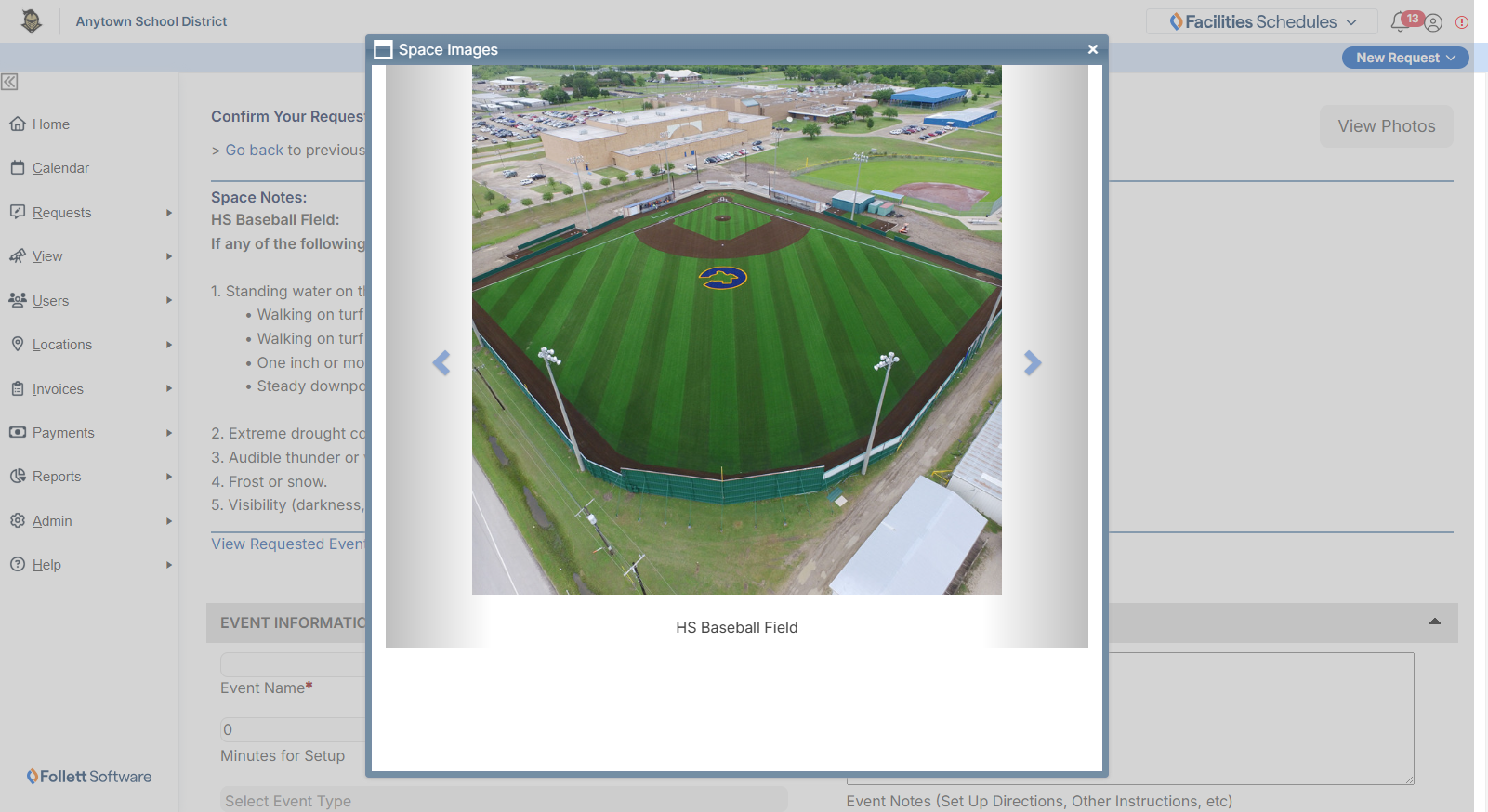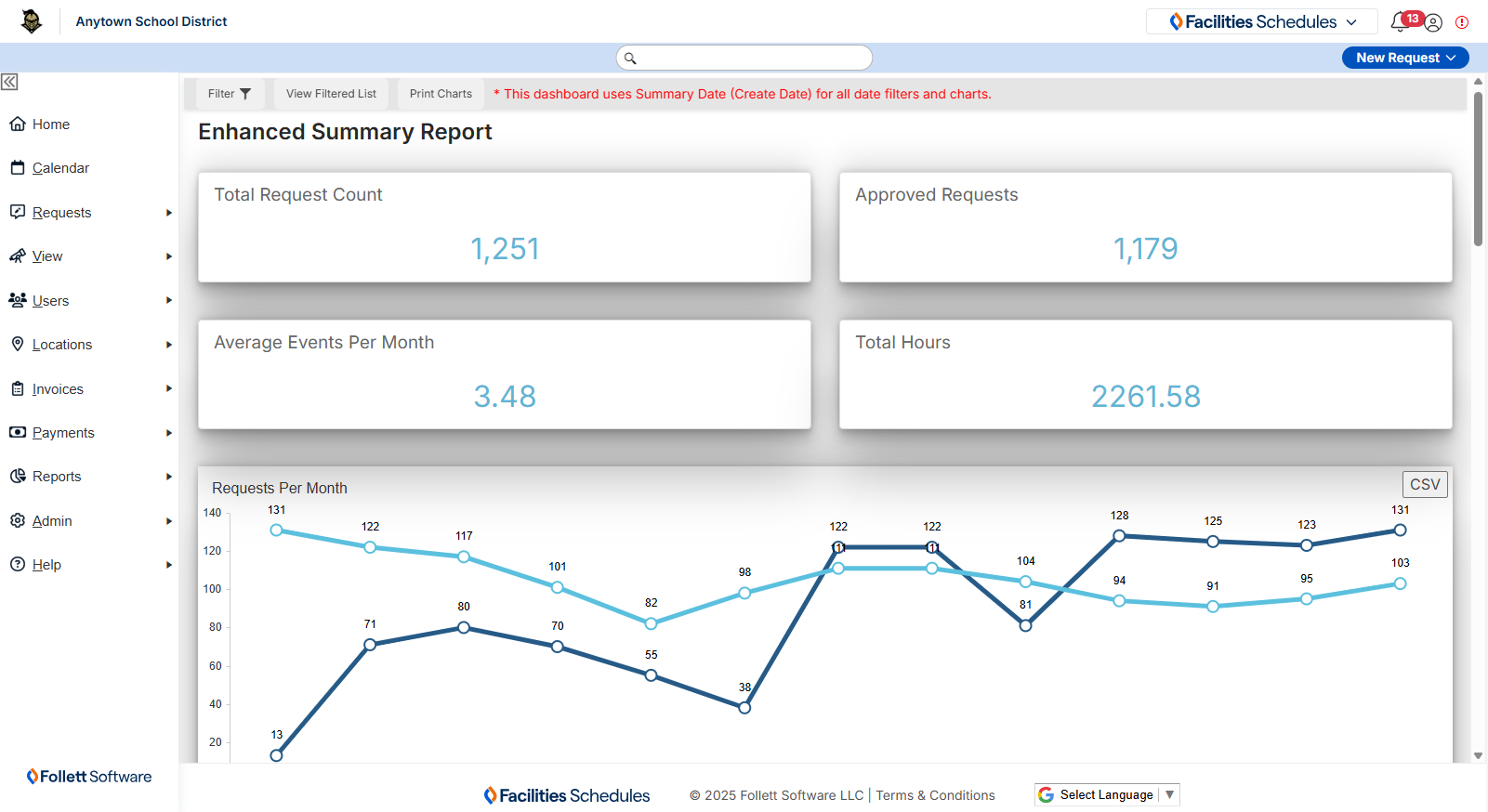 Además, Facilities Schedules ofrece herramientas robustas de informes y análisis que permiten a los usuarios obtener información sobre los patrones de uso de las instalaciones. Estos datos pueden ser invaluables para tomar decisiones informadas sobre la asignación de recursos y la planificación de futuros eventos. Al comprender cómo se utilizan las instalaciones, los distritos escolares pueden optimizar sus procesos de programación y asegurar que todos los espacios se utilicen de manera efectiva. Junto con los informes personalizables, viene la capacidad de facturar con el sistema. Esto permite a los distritos rastrear cualquier costo asociado con los eventos, como tarifas por hora, costos de equipo y tarifas de personal. Los informes están disponibles para la facturación y los pagos recibidos dentro del sistema.