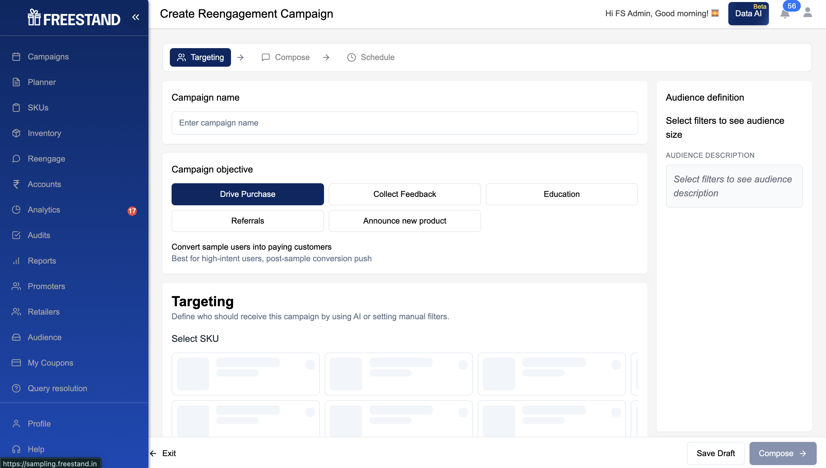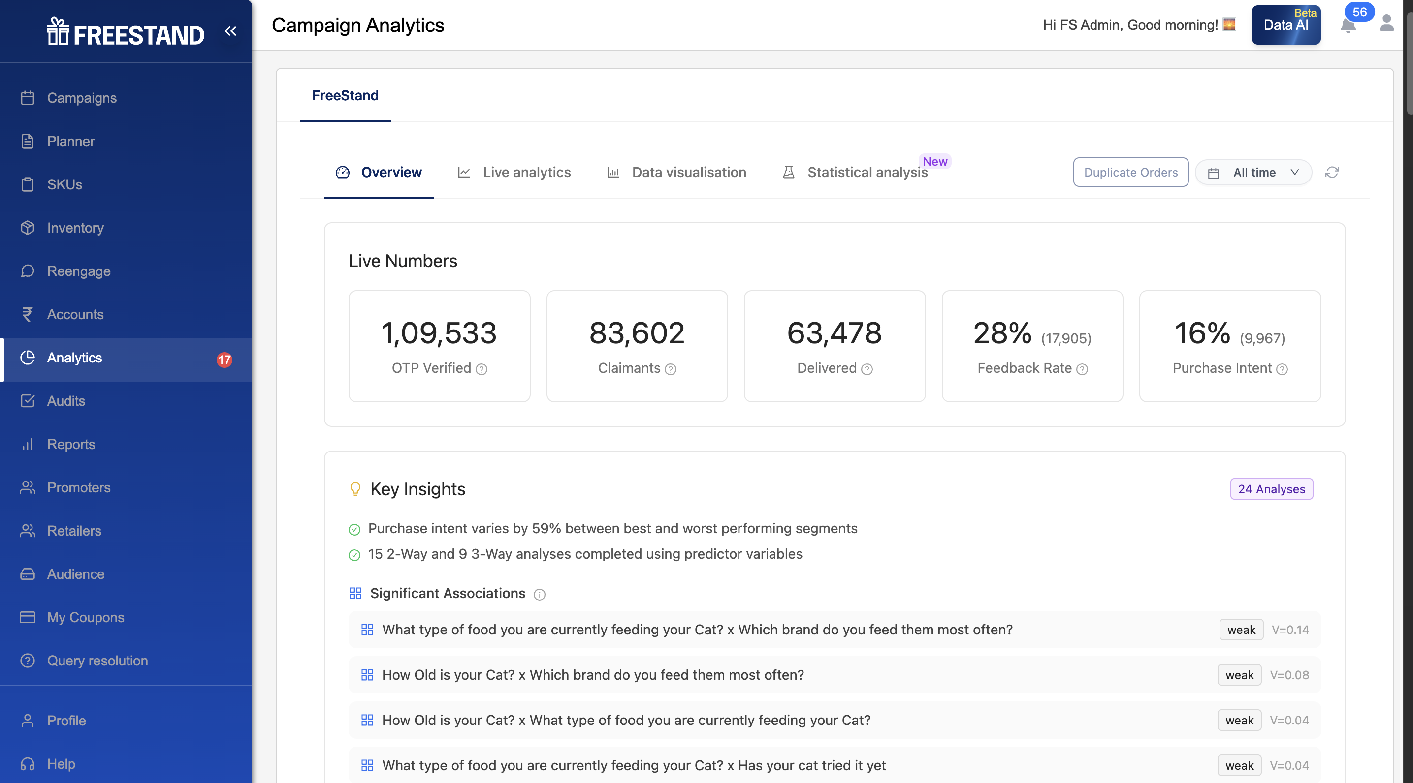 Freestand gestiona todo el espectro de actividades de muestreo de principio a fin para Mars Petcare para las marcas Pedigree, Whiskas y Sheba. Principalmente, Freestand UI, en la que confío diariamente, proporciona datos detallados que nos permiten tomar decisiones informadas basadas en datos.