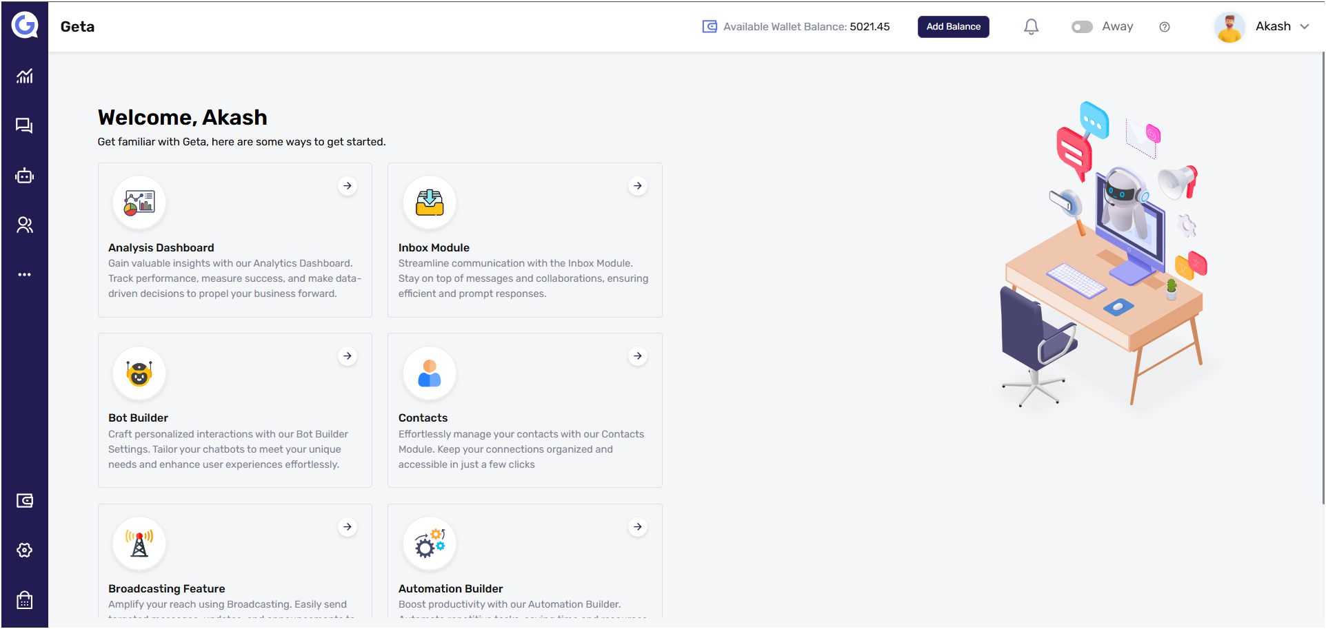 Las características de chatbot y automatización son de primera categoría. Por ejemplo, estamos usando el chatbot en nuestro sitio web para recopilar leads y también resolver consultas de los usuarios. La mejor característica es su función de bot de IA inteligente que responde automáticamente a las consultas de los usuarios al instante. También estamos usando el módulo de contacto de esta plataforma para almacenar y gestionar leads. Además, su módulo de viaje de automatización es un cambio de juego. Por ejemplo, lo estamos usando para configurar campañas de goteo a través de varios canales.